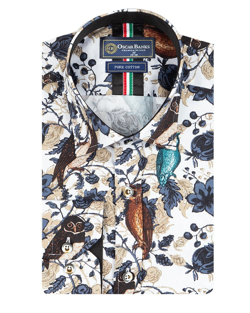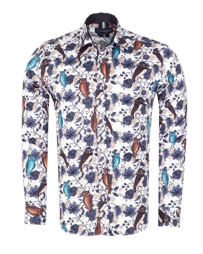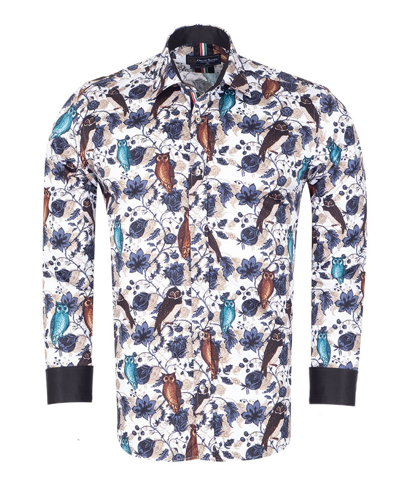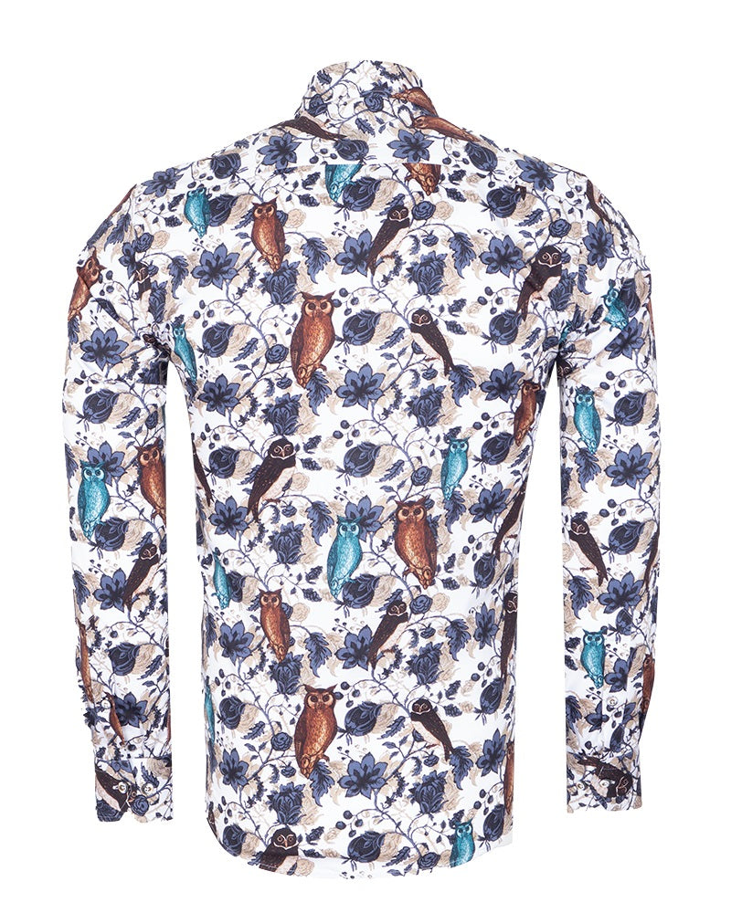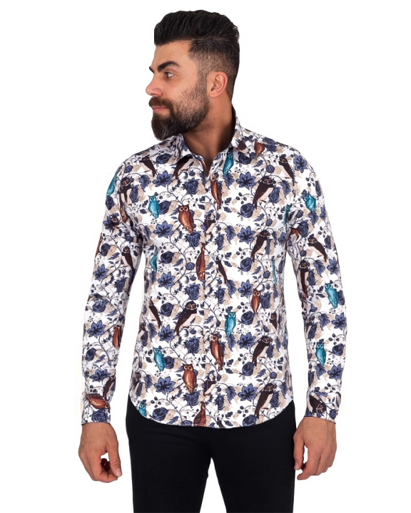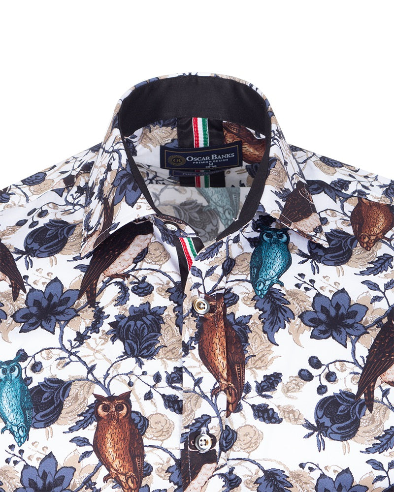 Beige Owl Print Men's Shirt with Matching Handkerchief