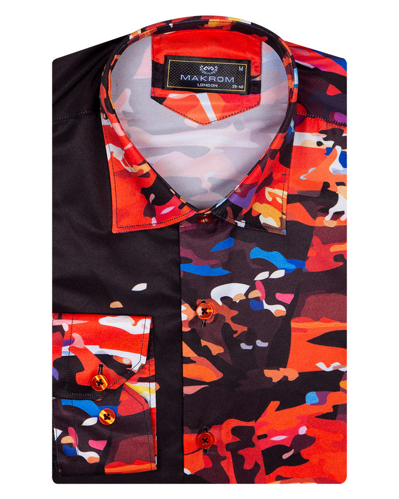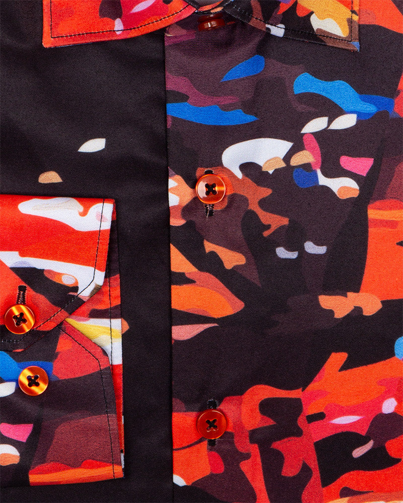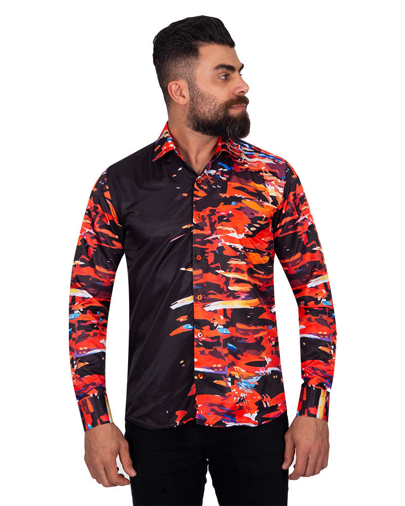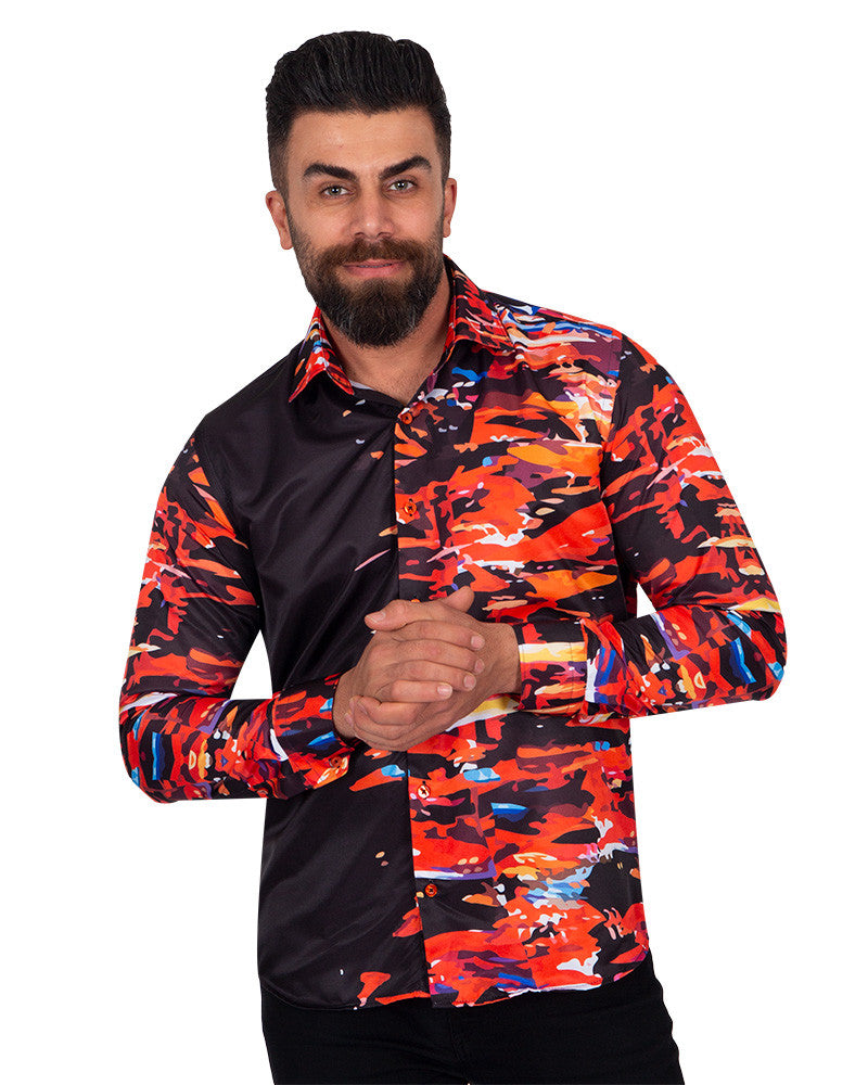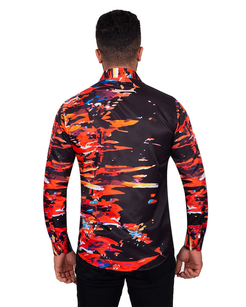 Introducing the Black Abstract Paint Splatter Print Shirt, a unique addition to your wardrobe. This shirt features an eye-catching abstract paint splash design that adds a modern twist to classic style.