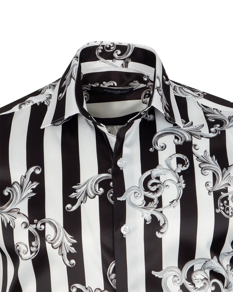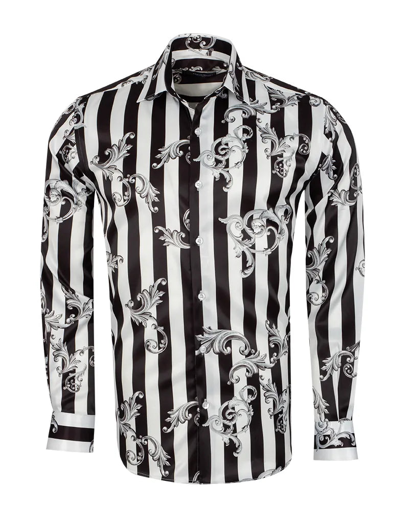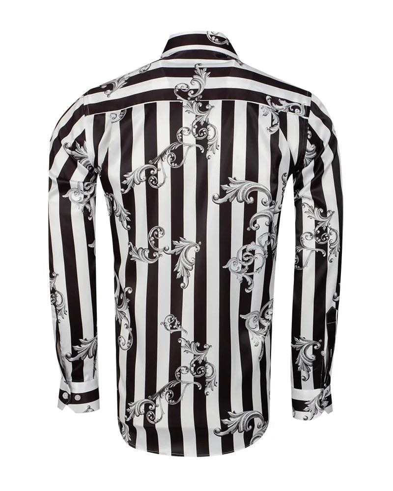 Introducing the Black Baroque Stripe Paisley Print Men`s Shirt, a perfect blend of elegance and comfort. This shirt features a stunning Roman ornament print that adds a touch of sophistication to any outfit.