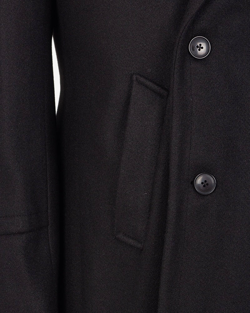 - Features a double-breasted front with snap buttons, combining classic tailoring with modern practicality.