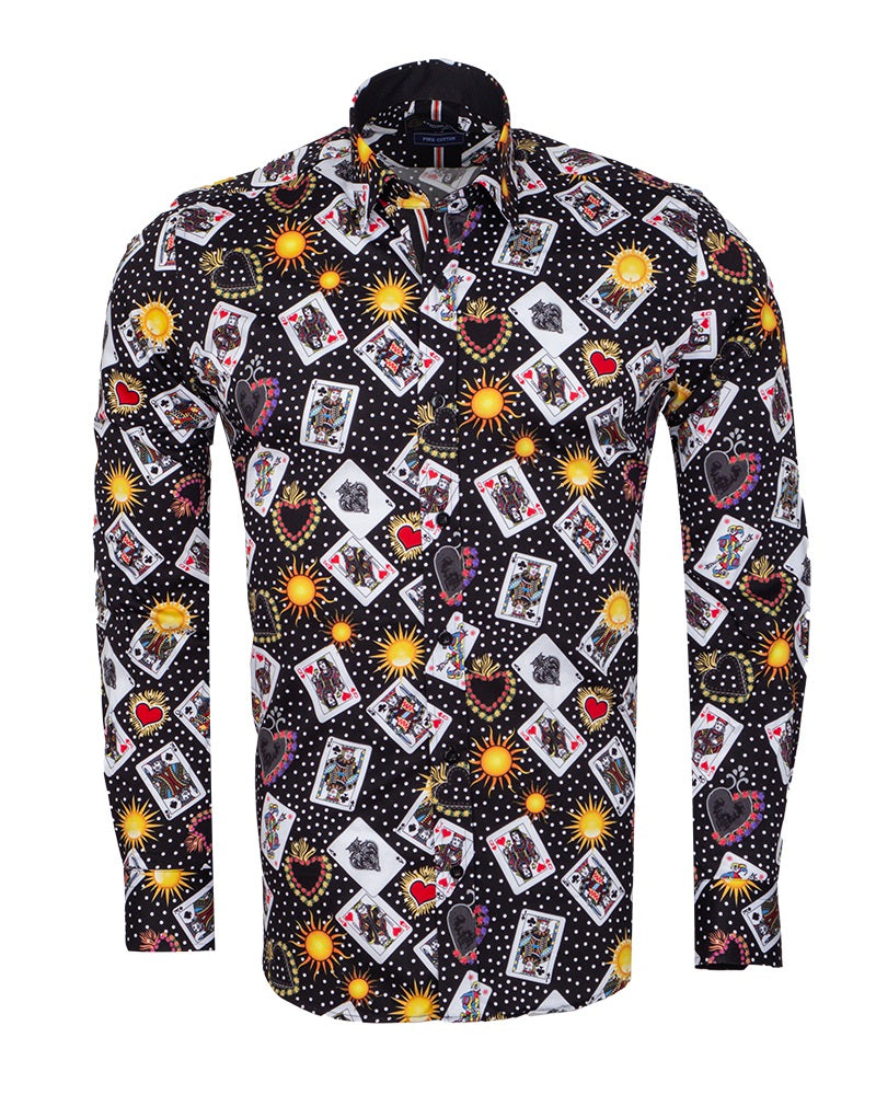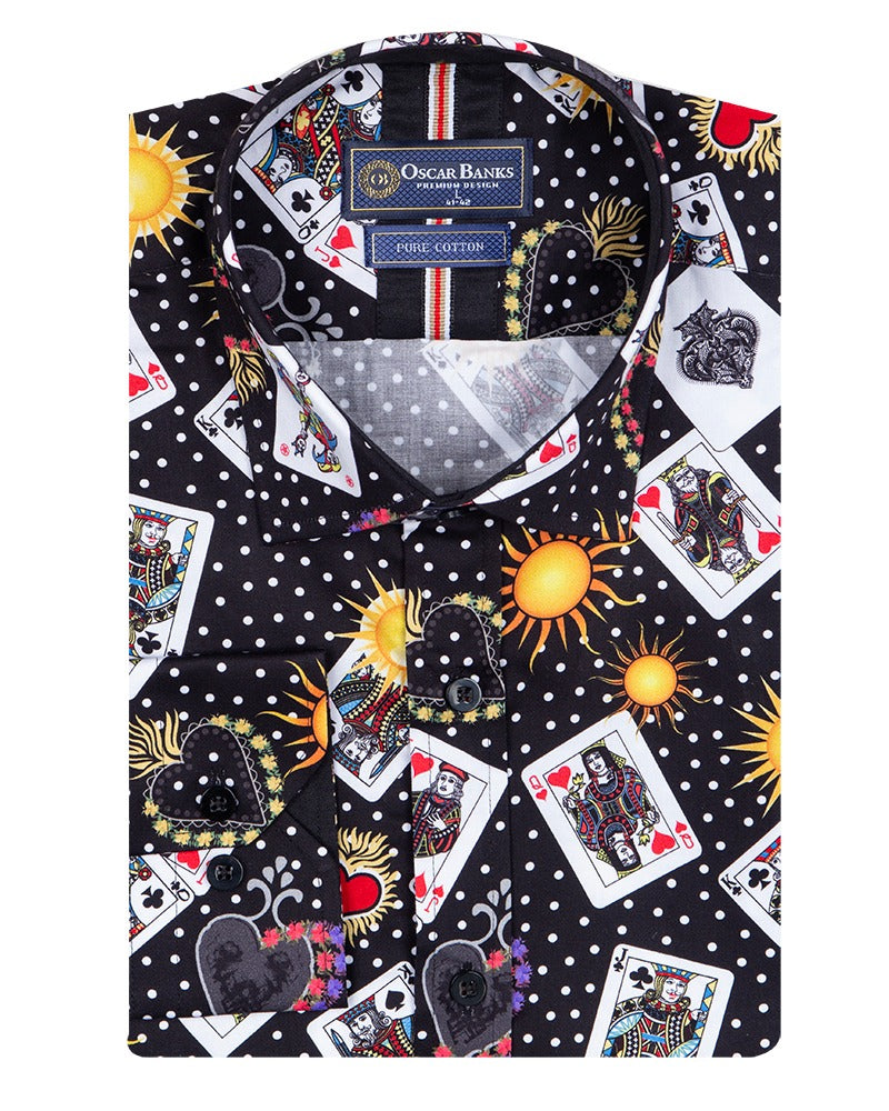 Introducing the Black Playing Card Print Shirt with Matching Handkerchief, a truly unique addition to your wardrobe. Crafted from 100% satin cotton, this shirt offers a luxurious feel while showcasing a playful yet sophisticated design.