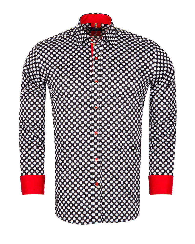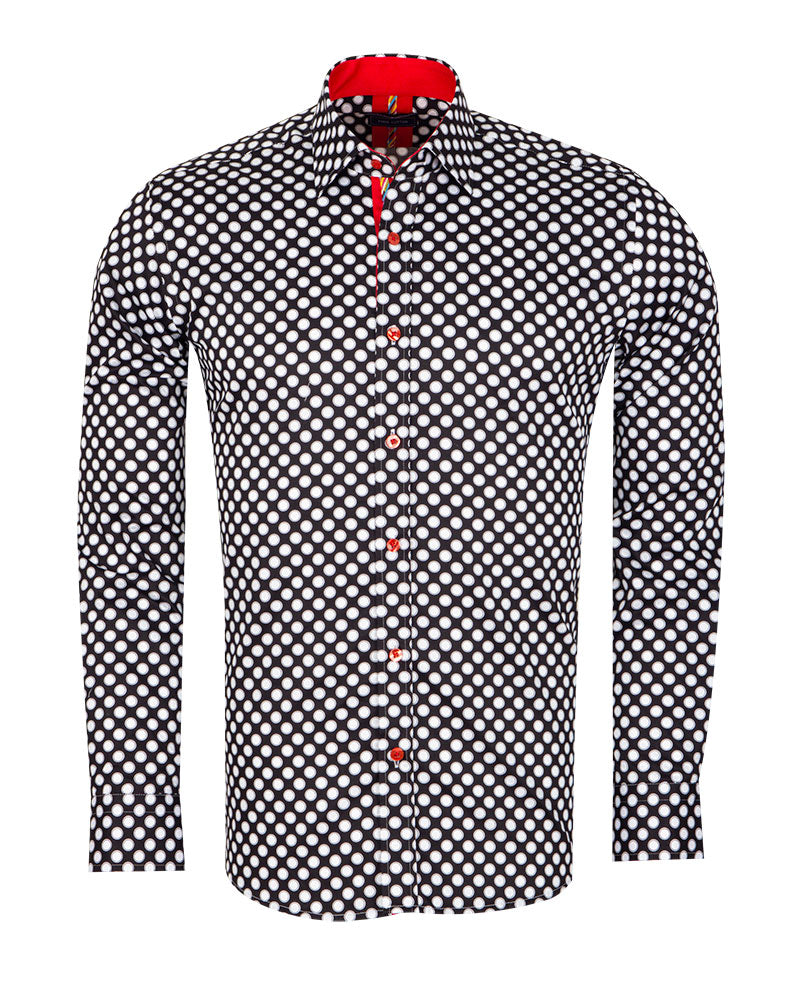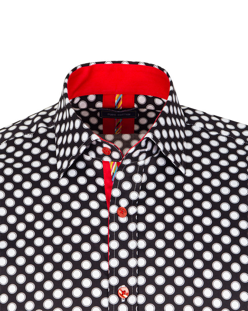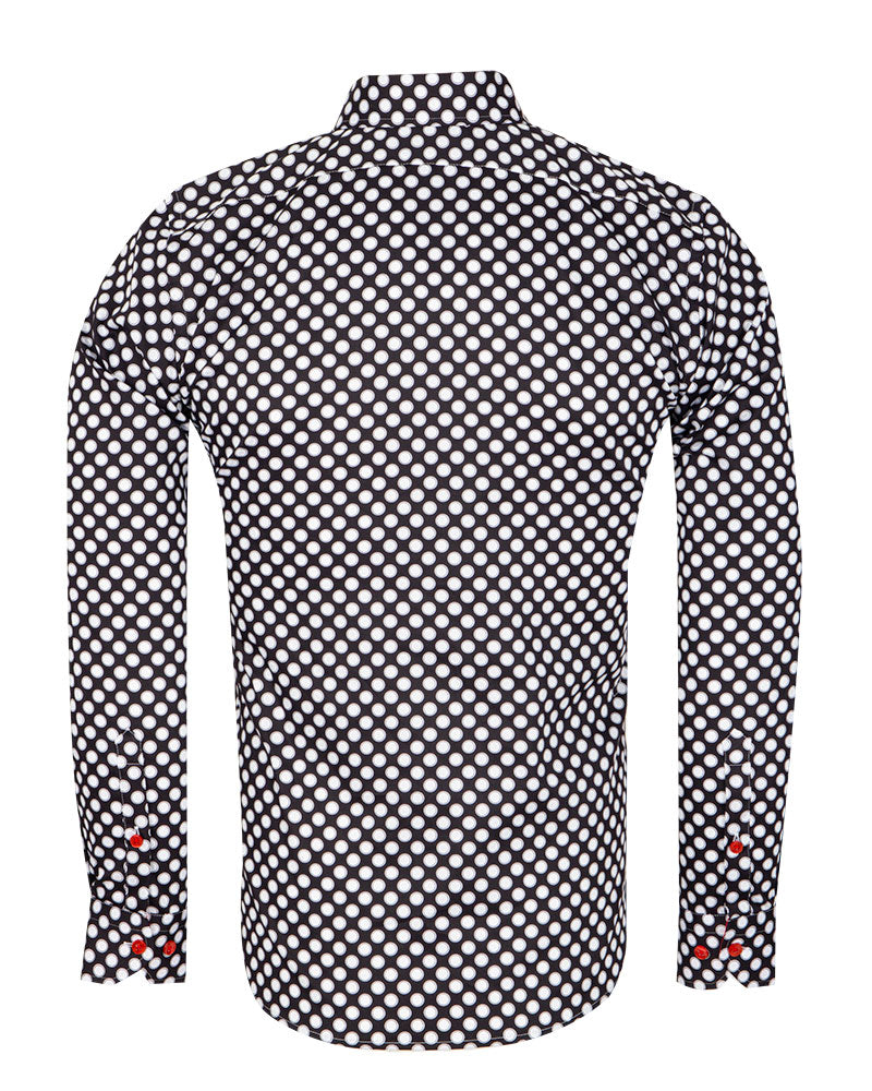 Introducing the Black Polka Dot Print Pure Cotton Shirt, a stylish addition to any wardrobe. This shirt features a classic polka dot print that adds a touch of sophistication to your outfit.