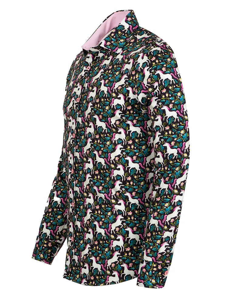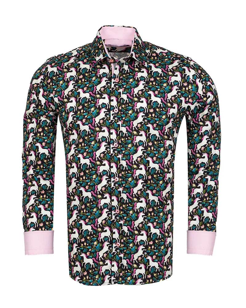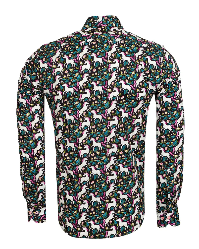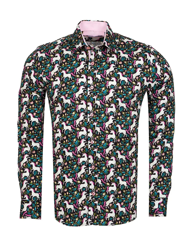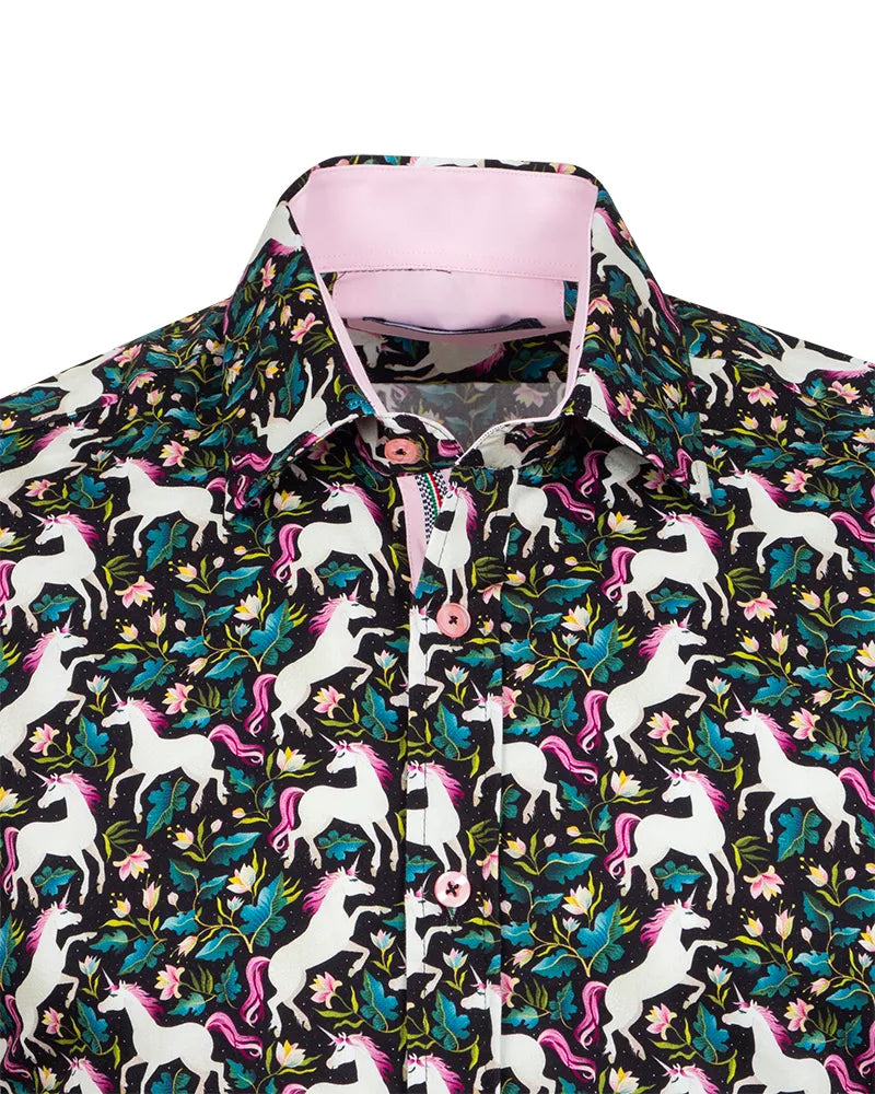 Introducing the Black Vibrant Unicorn and Floral Print Print with Matching Handkerchief, a truly unique addition to your wardrobe. Crafted from 100% satin cotton, this shirt offers a luxurious feel while ensuring comfort throughout the day.