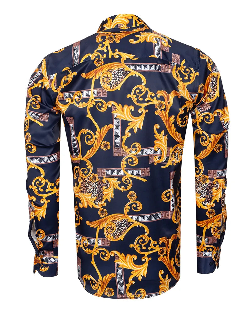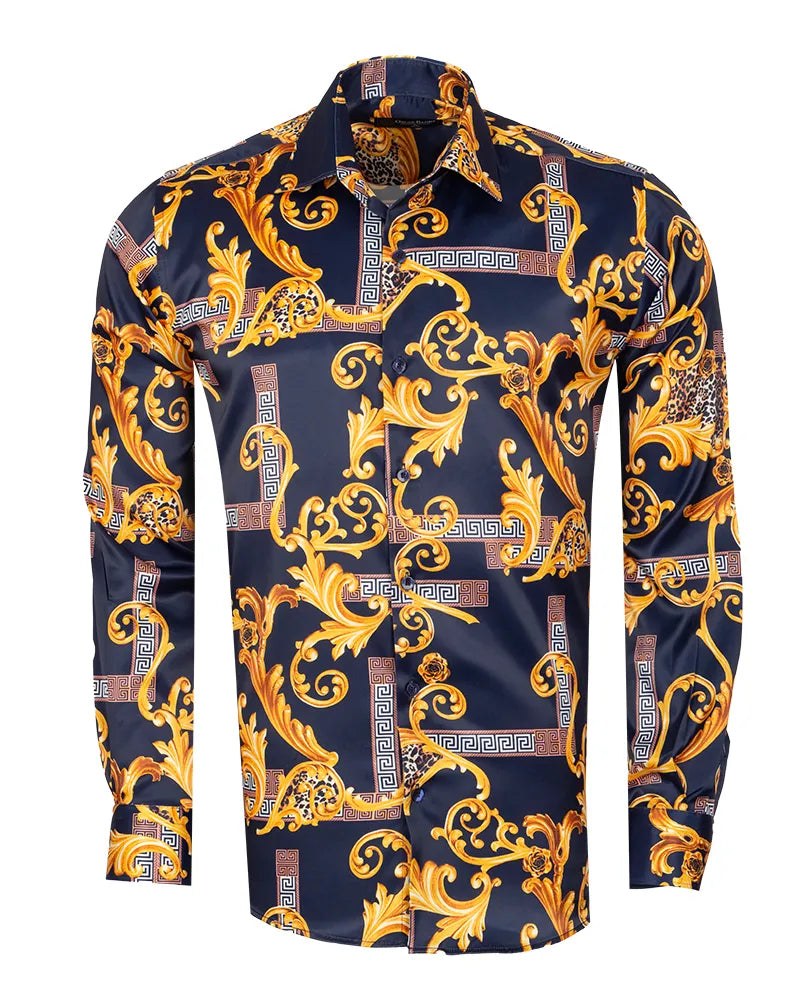 Introducing the Dark Blue Baroque Paisley Print Men`s Shirt, a perfect blend of elegance and comfort. This shirt features a stunning Roman ornament print that adds a touch of sophistication to any outfit.