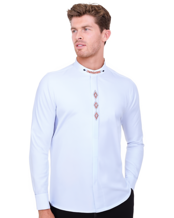This shirt features a unique grandad collar design, offering a modern twist on a classic look. The clip-on chain adorned with sparkling diamantes adds a touch of elegance, making it perfect for both casual and formal occasions.