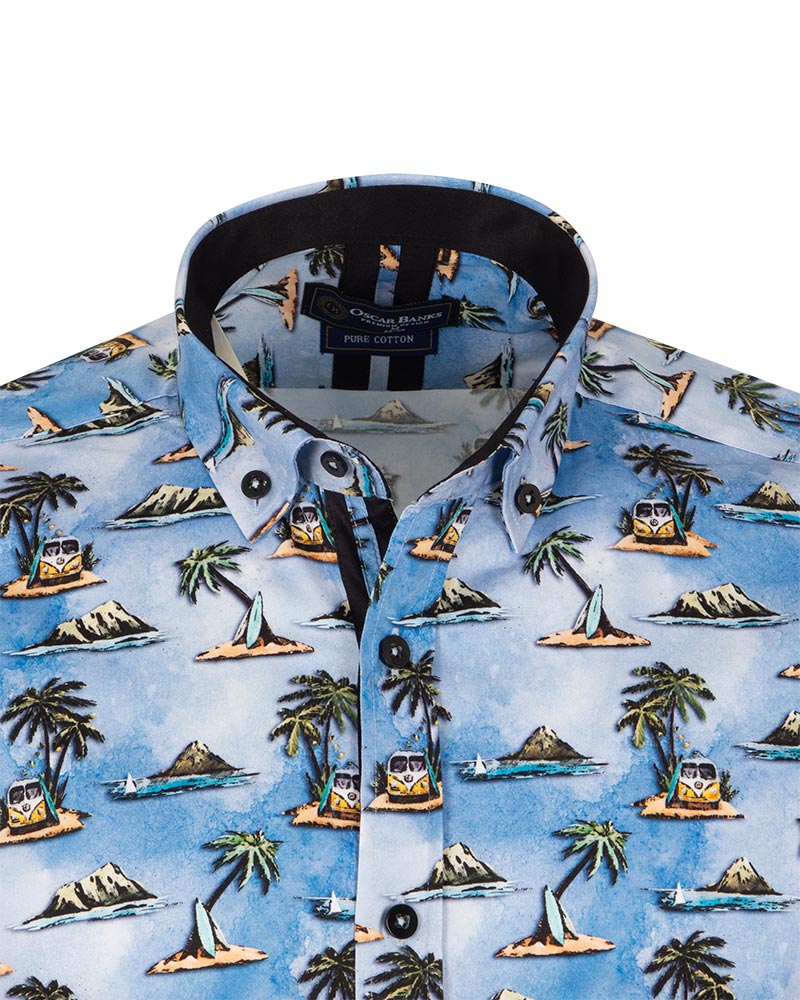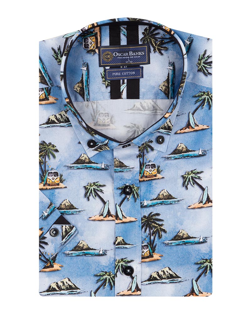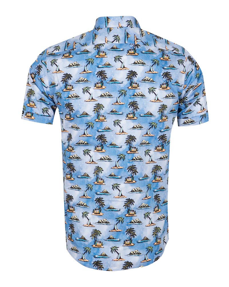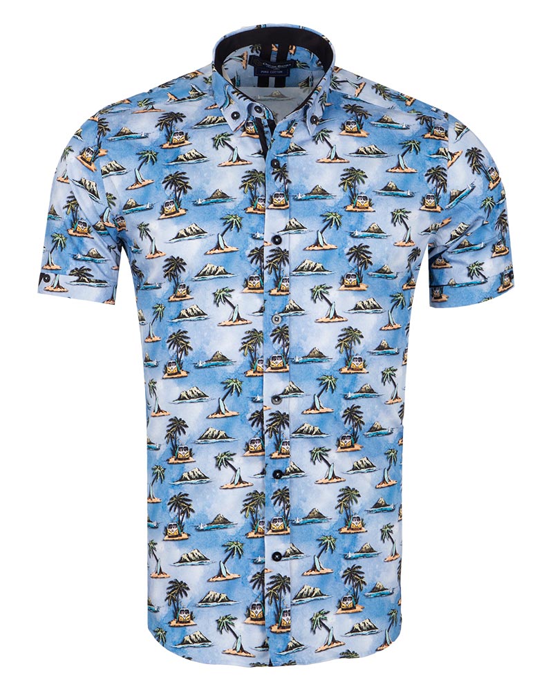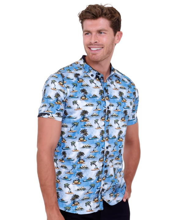 Discover the Blue Island Print Short Sleeve Shirt, a perfect blend of style and comfort. Crafted from 100% satin cotton, this shirt offers a luxurious feel against the skin.