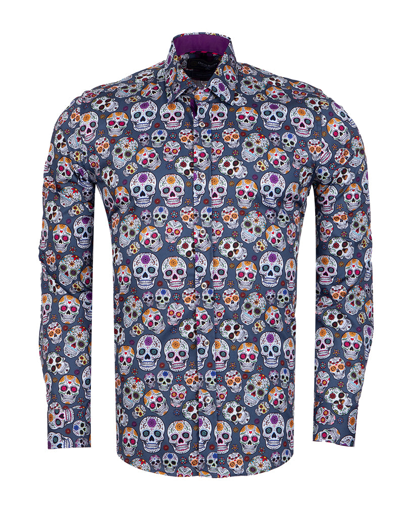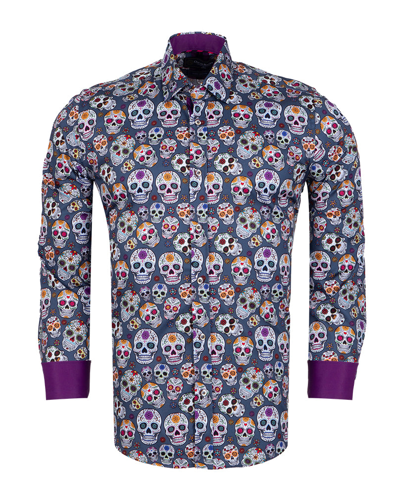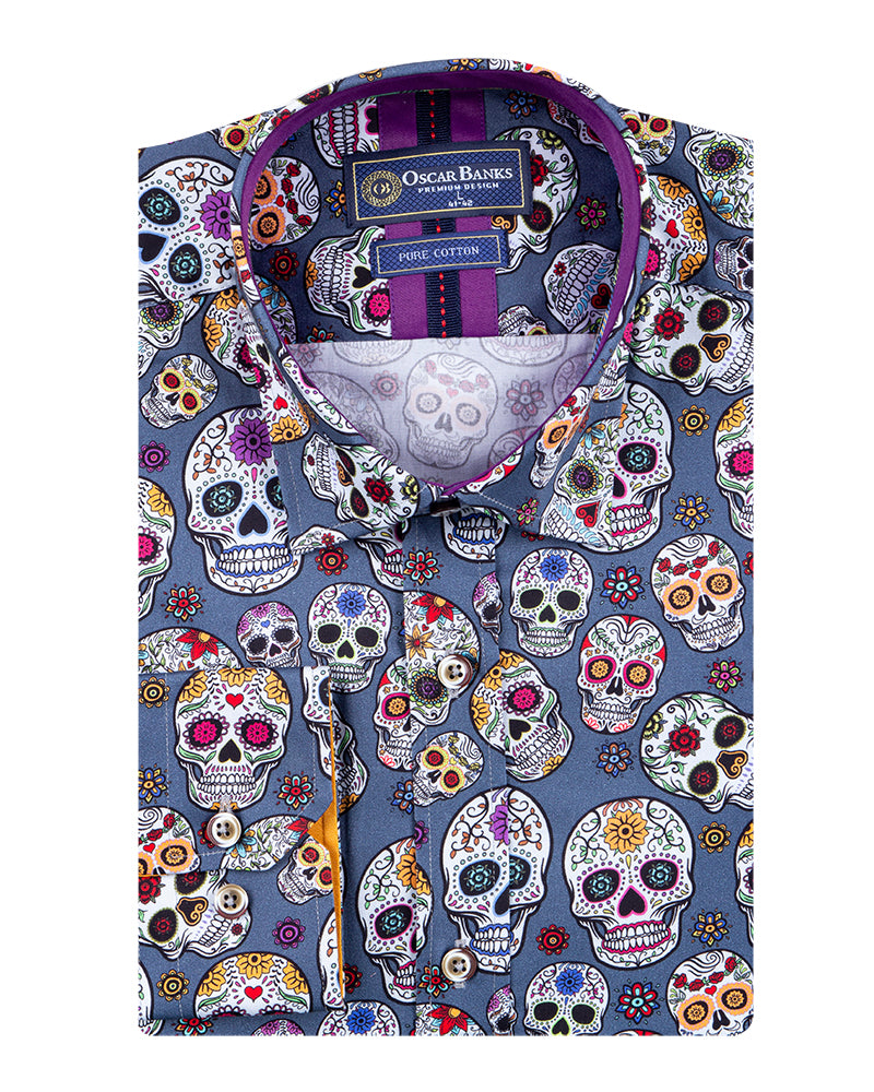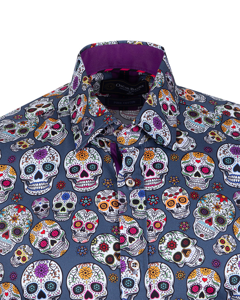 The shirt features a striking skull print, complemented by a contrasting collar and cuff for a modern touch. With single cuffs and two-button adjustable cuffs, it ensures a perfect fit for any occasion.