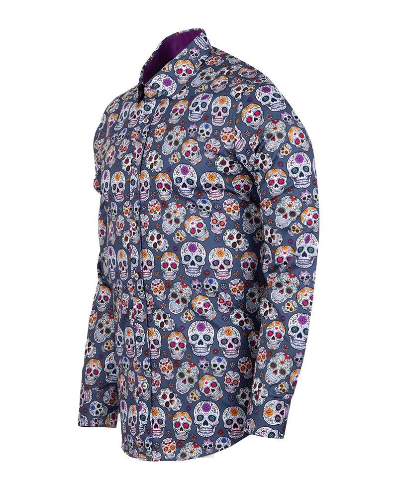 Introducing the Blue Day of the Dead Skull Print Shirt with Matching Handkerchief, a unique addition to your wardrobe. Crafted from 100% satin cotton, this shirt offers both comfort and style.