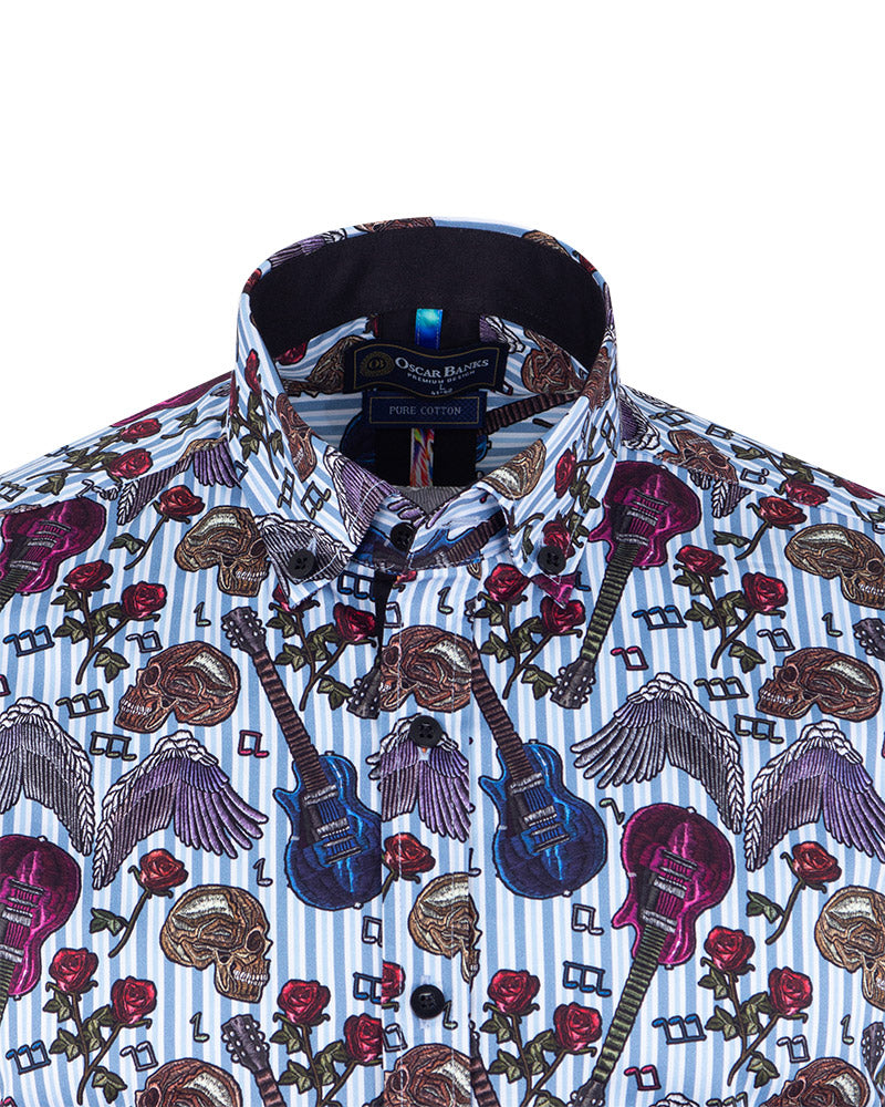 Featuring a unique guitar and skull print, it stands out with its contrasting collar and sleeve inserts. The button-down collar adds a touch of sophistication, making it suitable for both casual and semi-formal occasions.