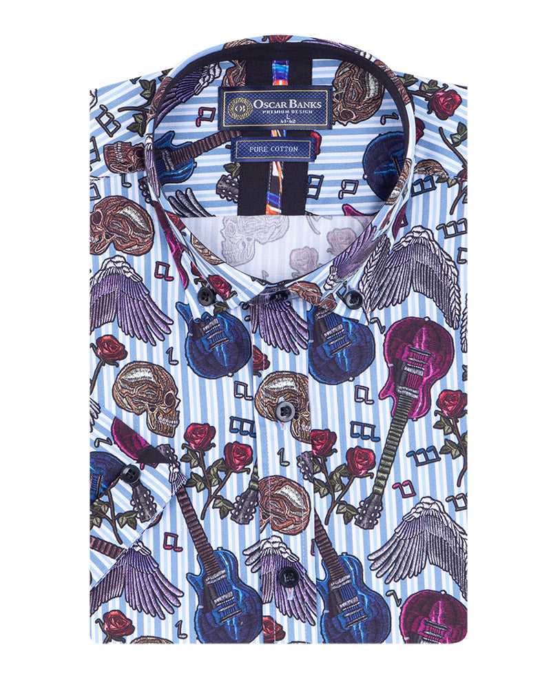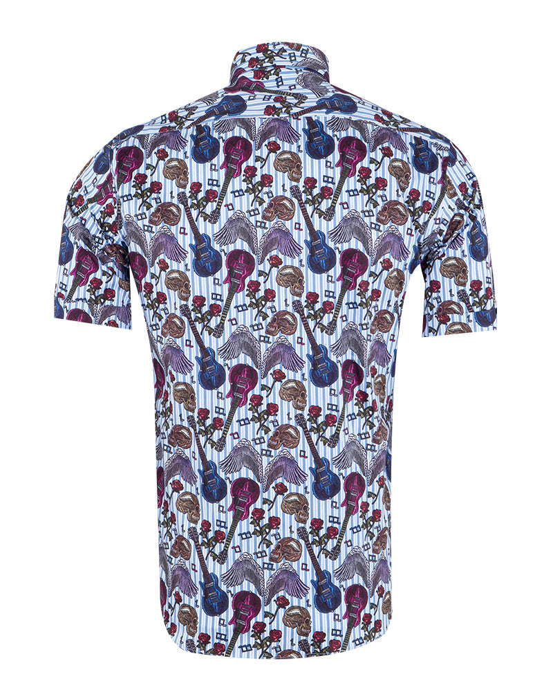 Blue Stripe Guitar and Skull Print Short Sleeve Shirt