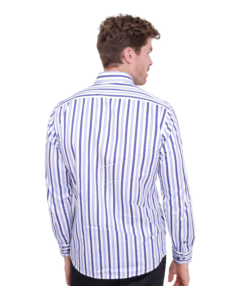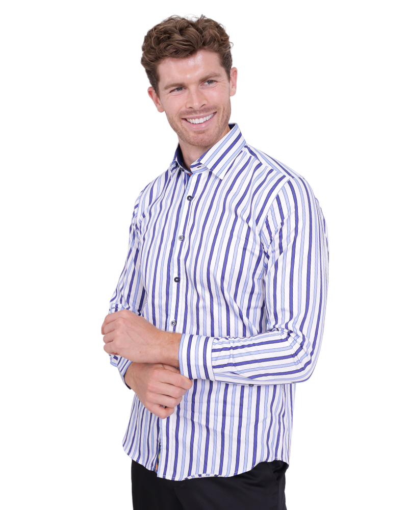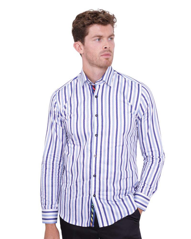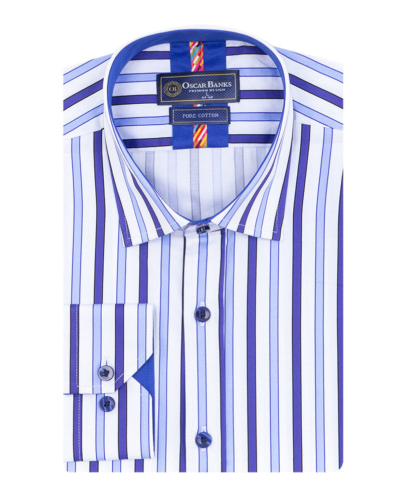 Elevate your wardrobe with the Blue Stripe Print Shirt, designed for the modern man. Crafted from 100% satin cotton, this shirt offers a luxurious feel and a stylish appearance.
