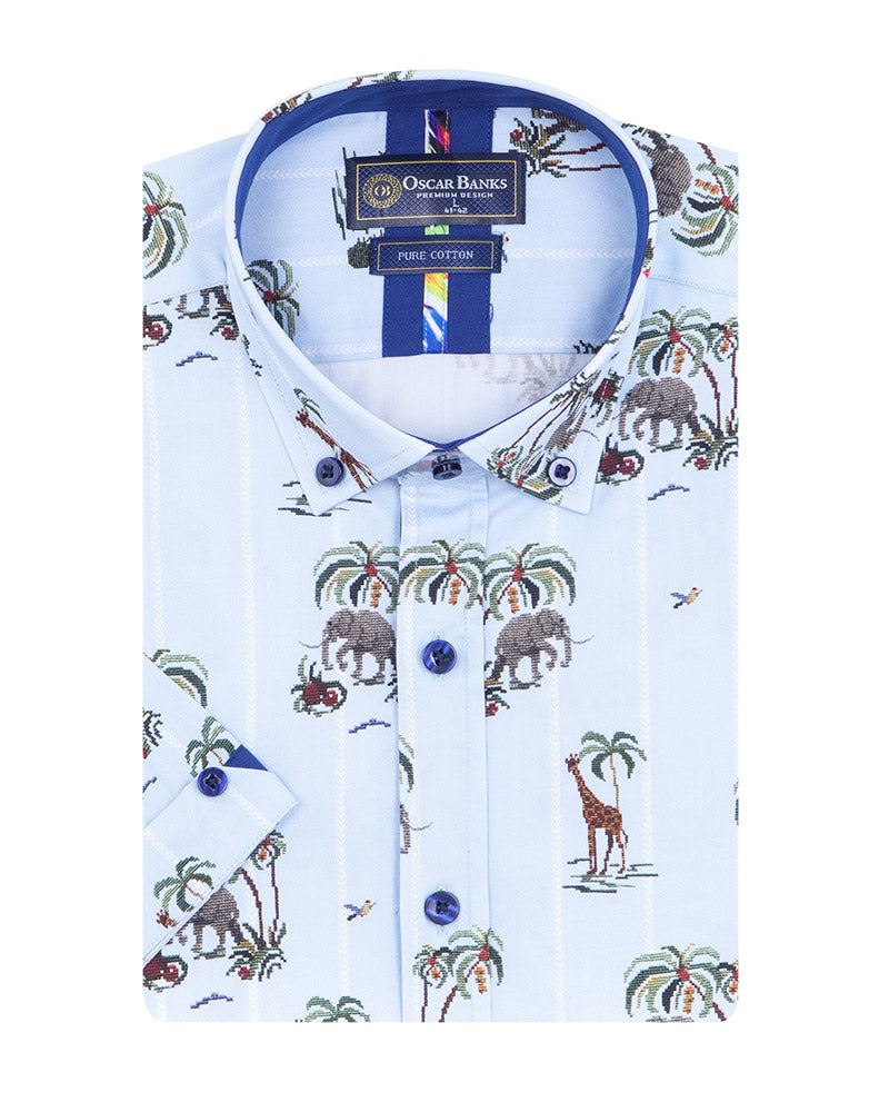 Introducing the Blue Tropical Animals Print Short Sleeve Shirt, a vibrant addition to your wardrobe. Crafted from 100% satin cotton, this shirt offers both comfort and style.