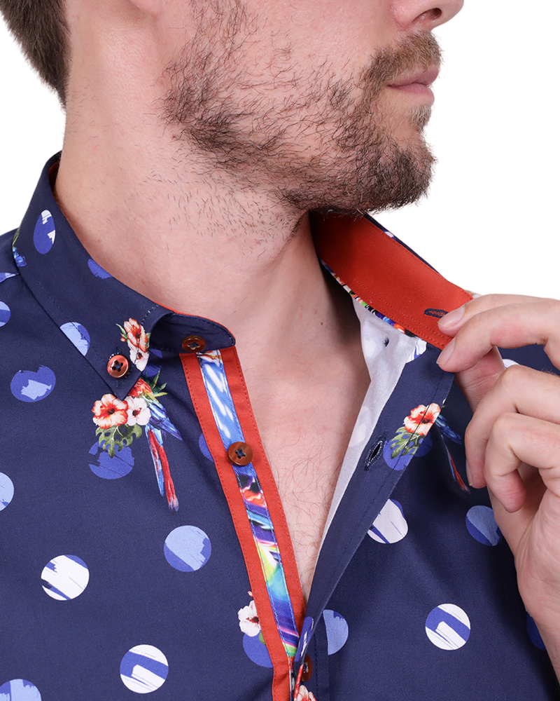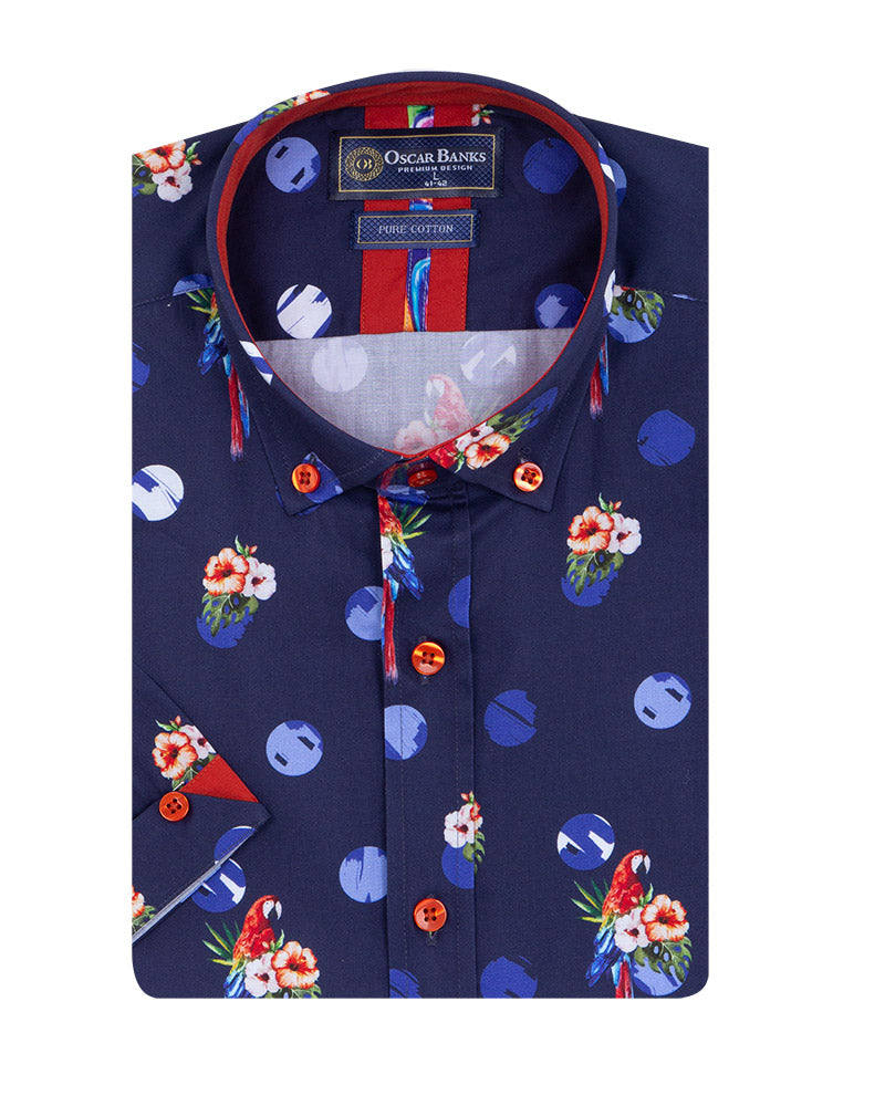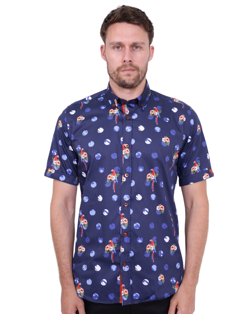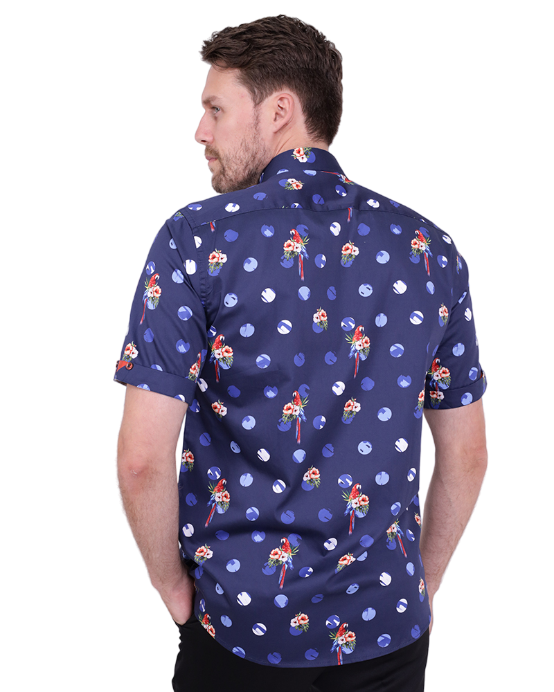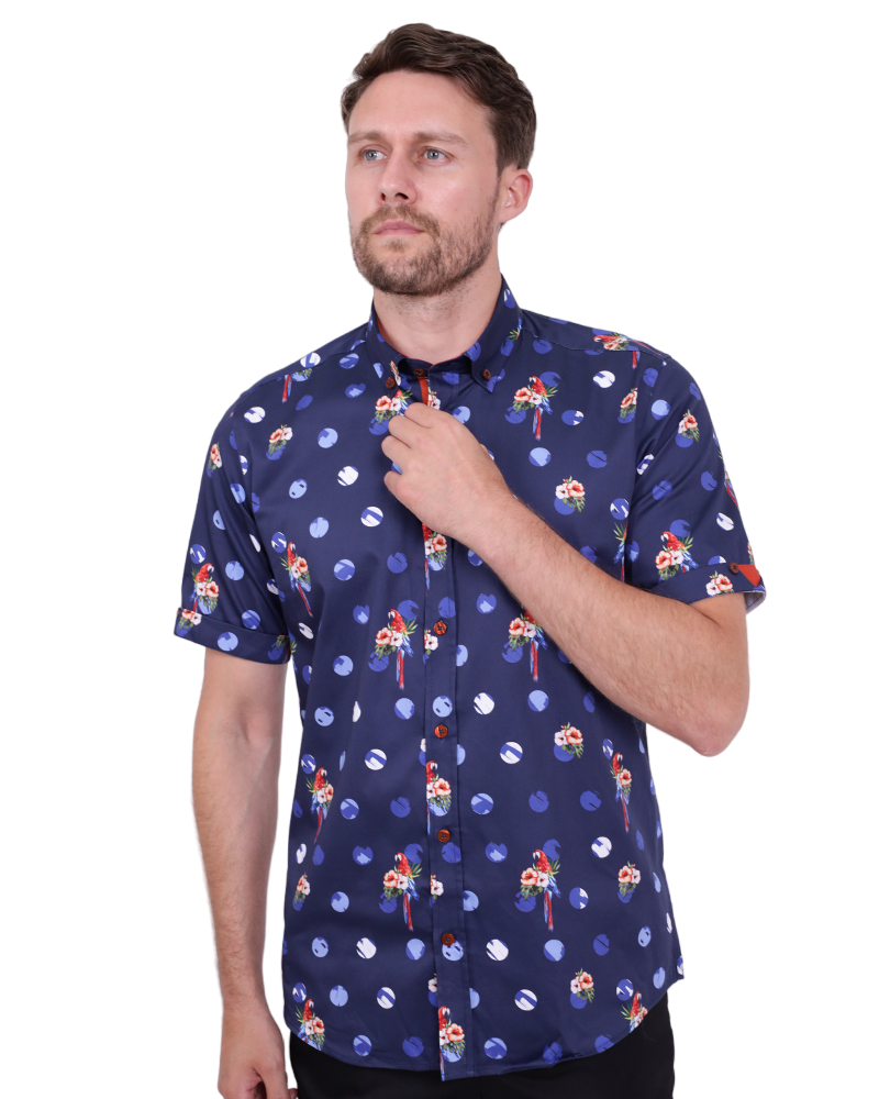 Featuring a unique parrot print, it’s perfect for those who love to stand out. The contrasting collar and sleeve insert add a touch of sophistication, while the button-down collar ensures a polished look.