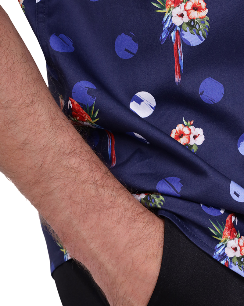 Introducing the Dark Blue Tropical Parrot Print Short Sleeve Shirt, a vibrant addition to your wardrobe. Crafted from 100% satin cotton, this shirt offers both comfort and style.