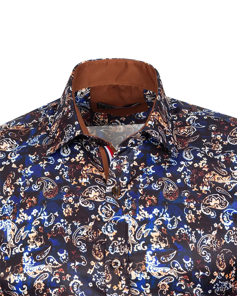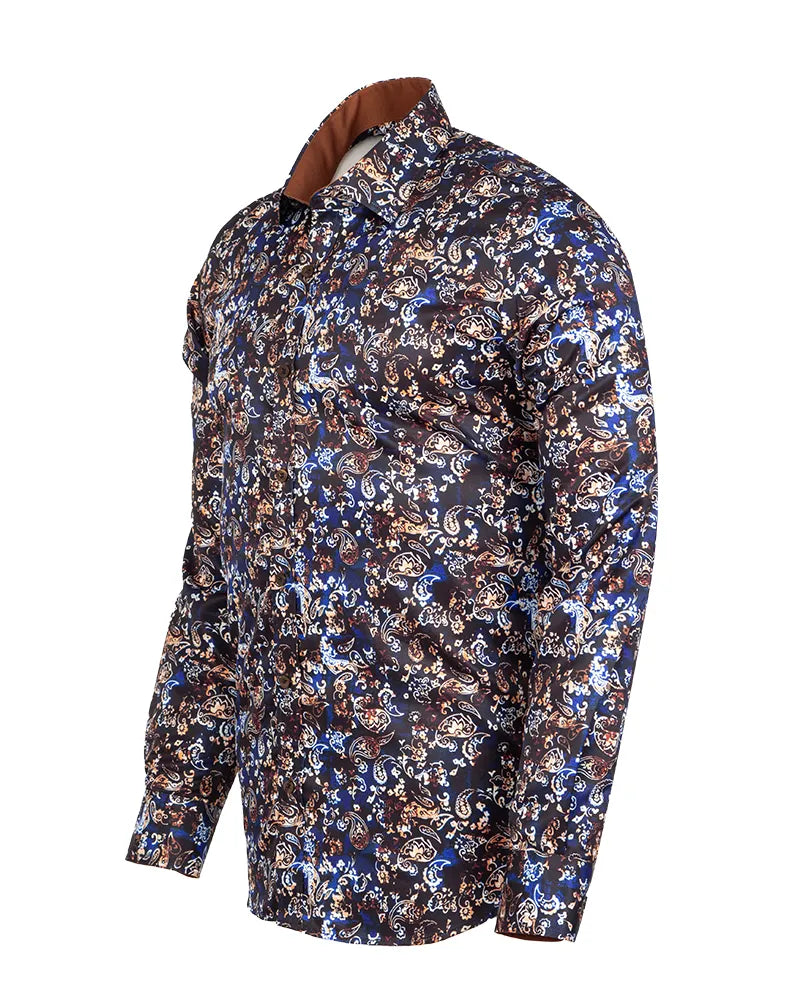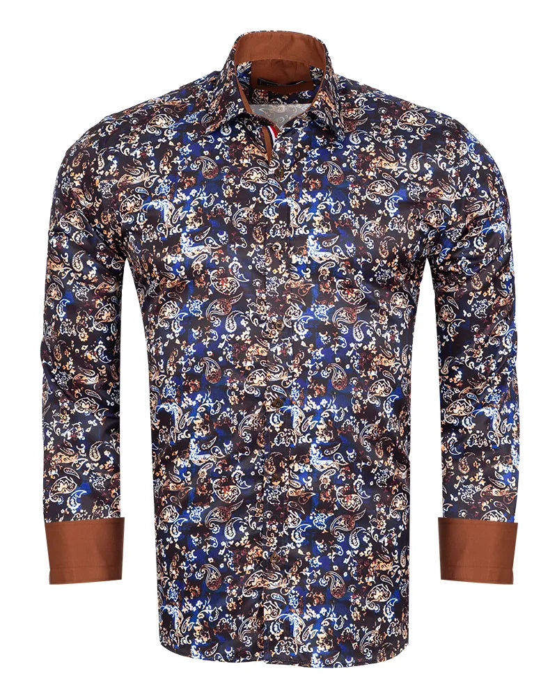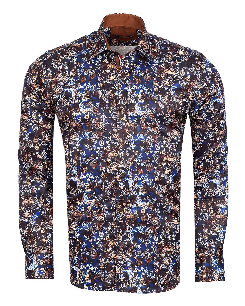 Introducing the Brown Paisley Print Long Sleeve Men`s Shirt, a vibrant addition to your wardrobe. This shirt features a stunning floral print that brings a touch of nature to your style.