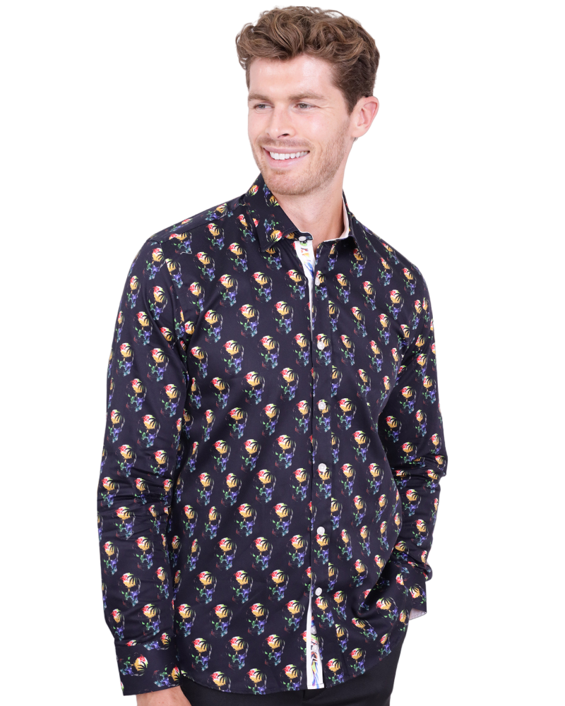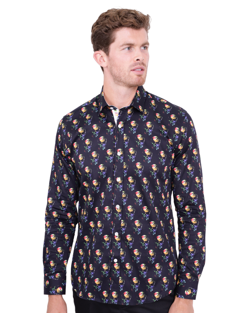 Introducing the Black Colourful Skull Print Shirt with Matching Handkerchief, a unique addition to your wardrobe. Crafted from 100% satin cotton, this shirt offers both comfort and style.