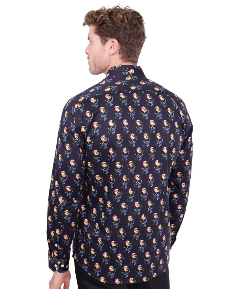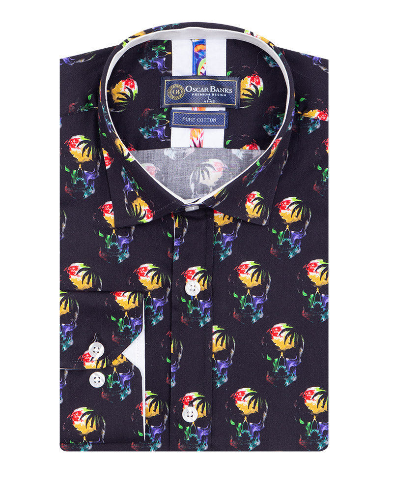 Black Colourful Skull Print Shirt with Matching Handkerchief