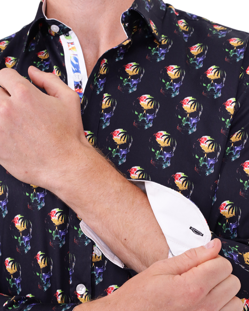 The shirt features a striking skull print, complemented by a contrasting collar and cuff for a bold look. It includes a matching handkerchief, making it perfect for any occasion.