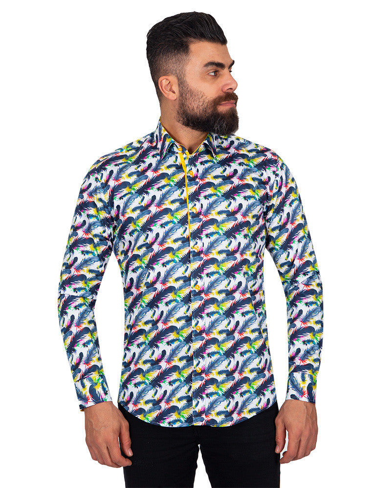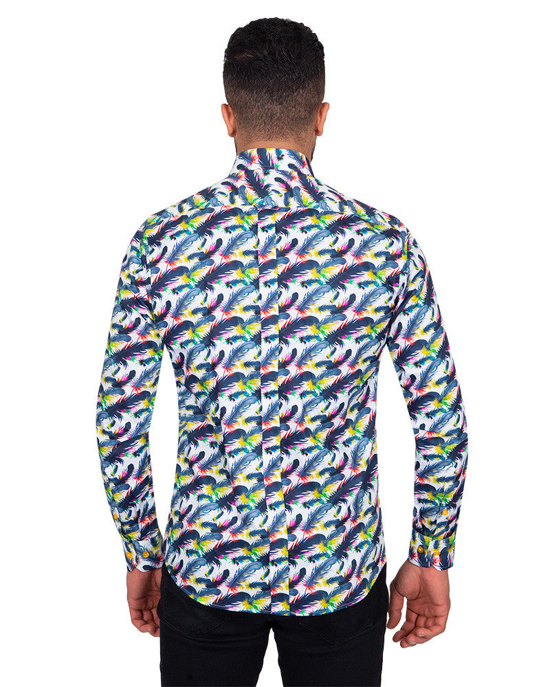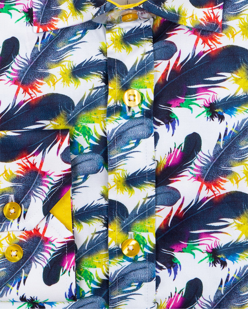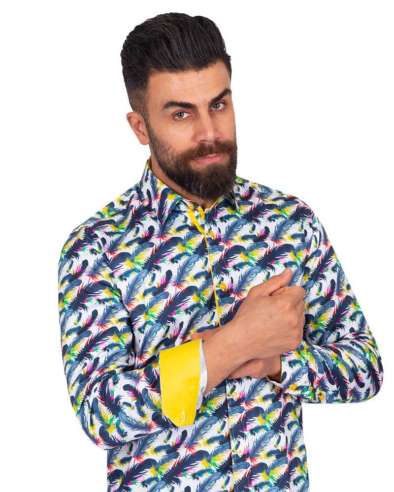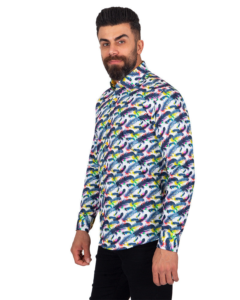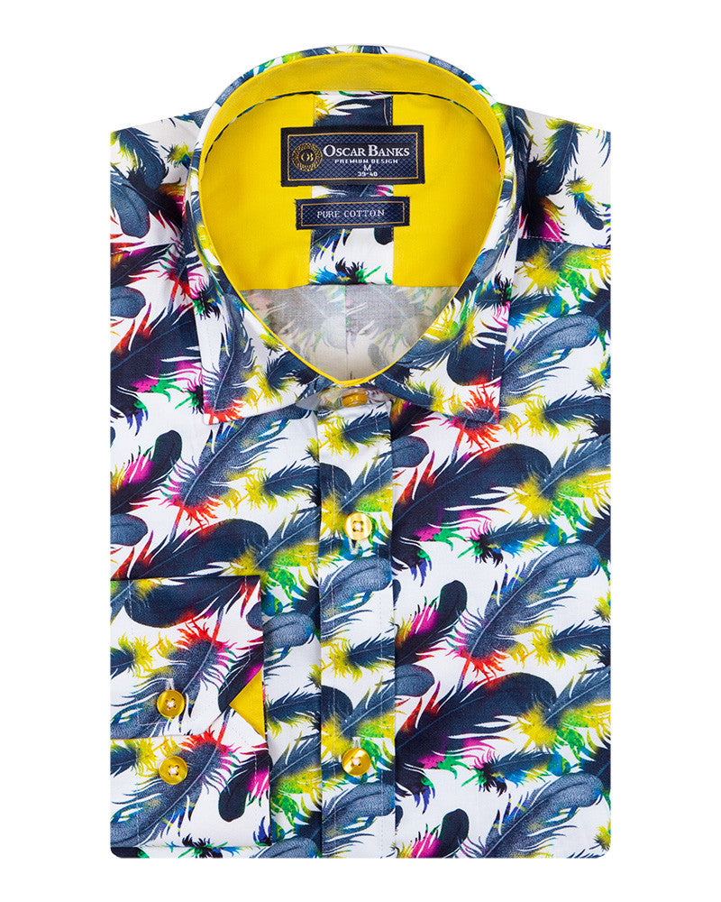 Discover the Colourful Feather Pure Cotton Print Shirt, a perfect blend of style and comfort. This shirt features a vibrant feather print that adds a touch of personality to your wardrobe.