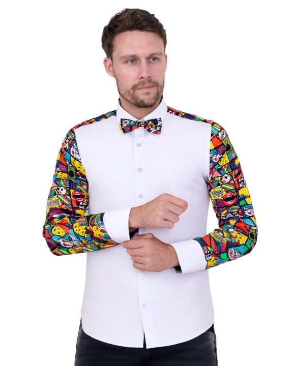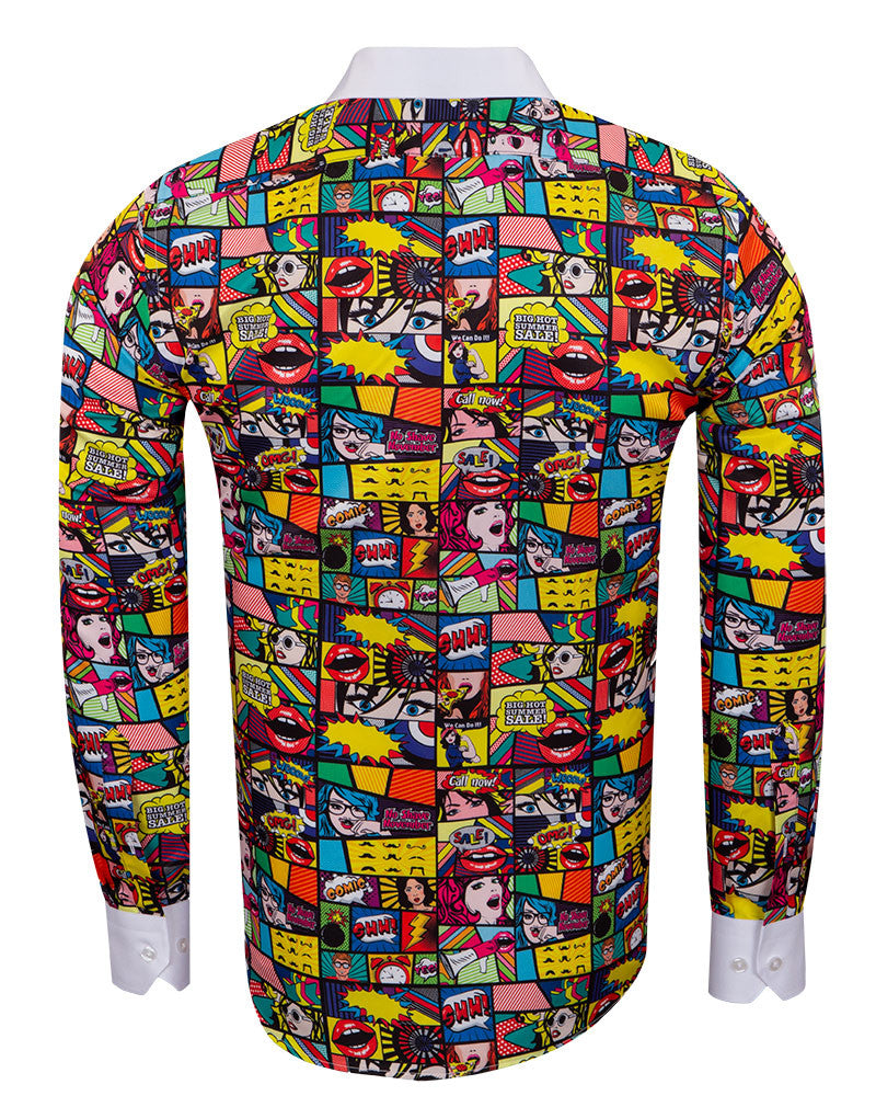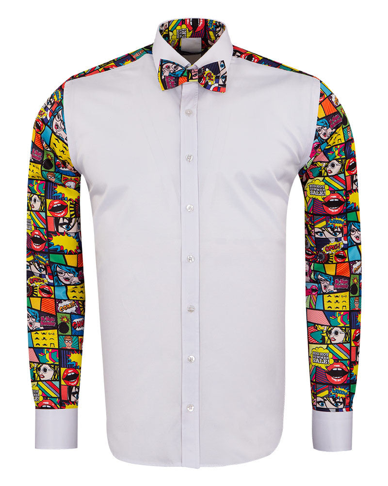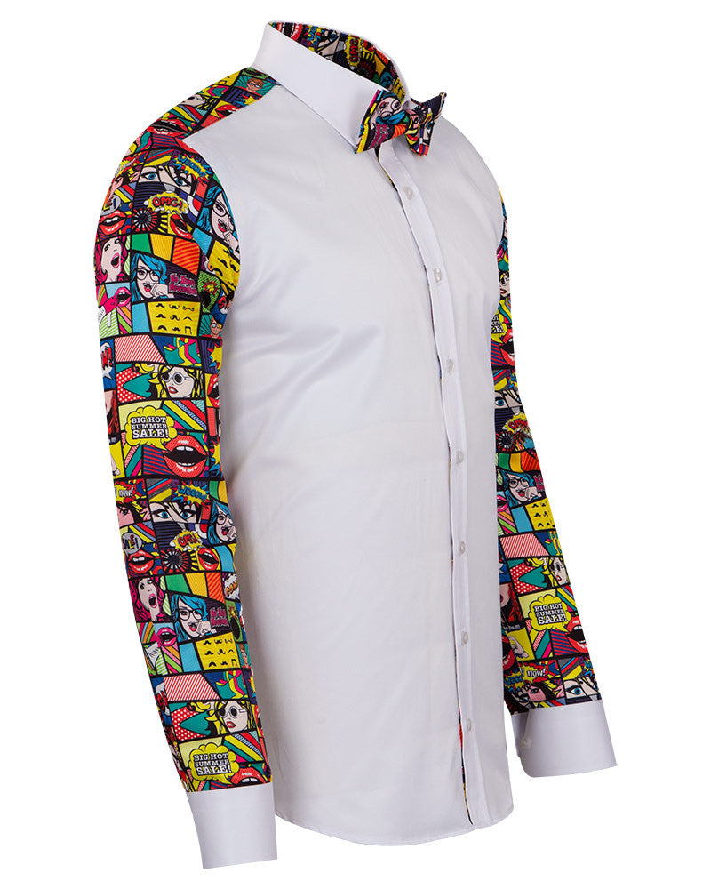 Introducing the Comic Book Print Tuxedo Shirt, a unique blend of style and fun. This shirt features a vibrant comic book print design that is sure to turn heads at any event.