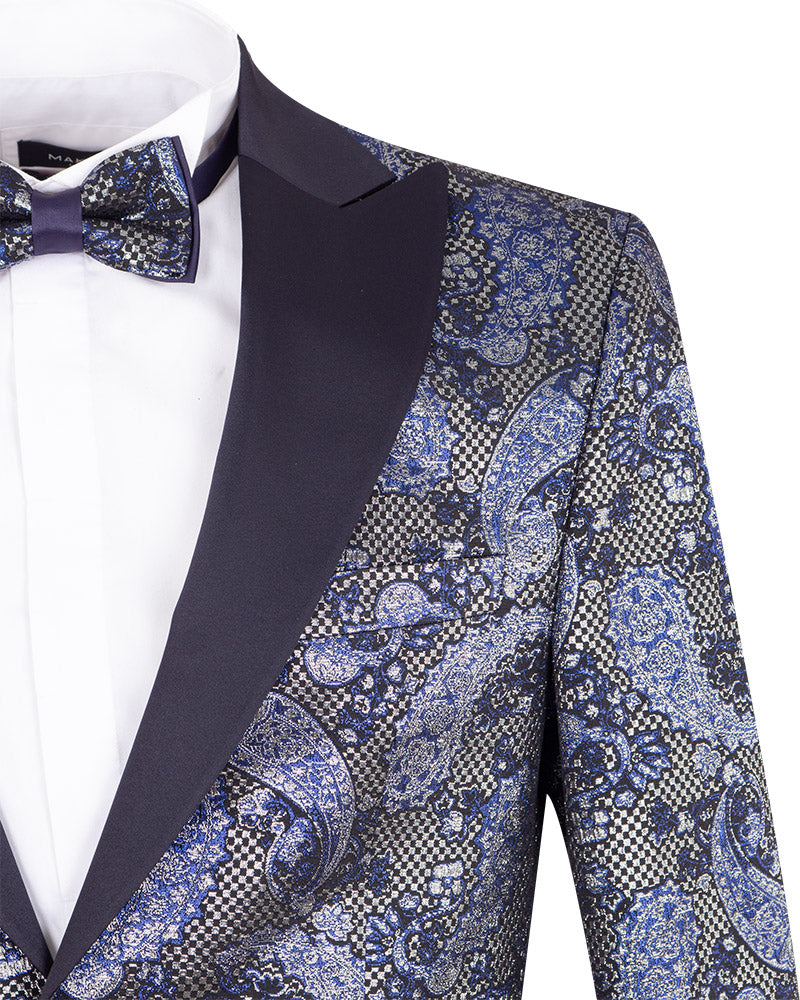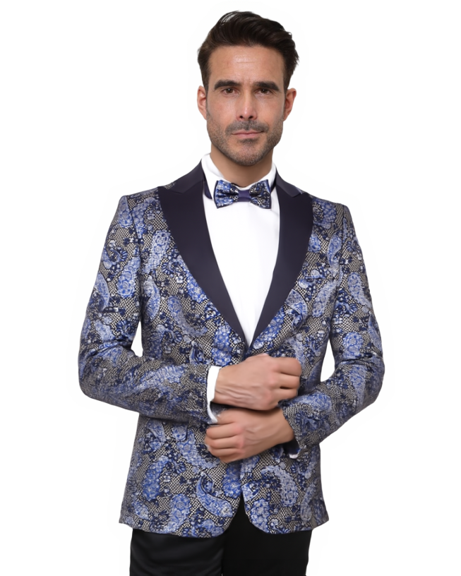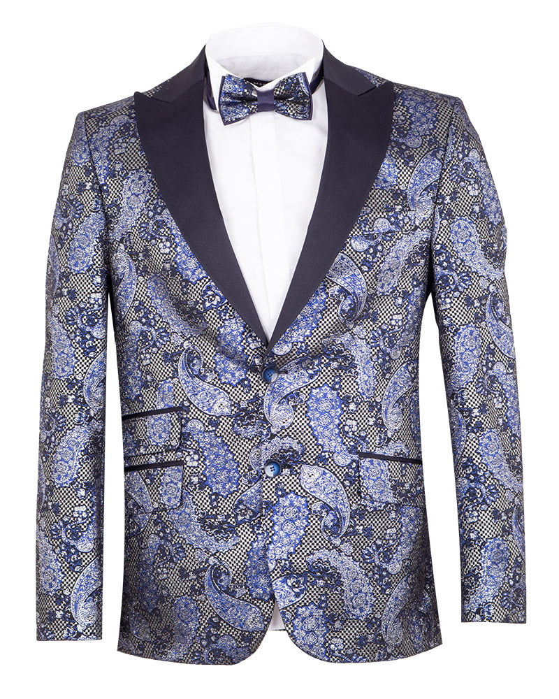Dark Blue Paisley Flock Design Fashion Blazer & Matching Bow Tie