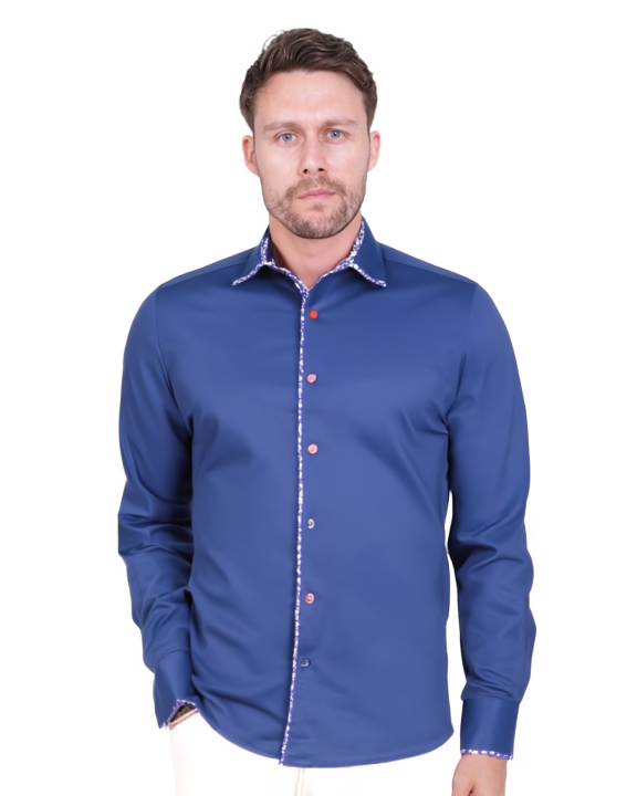 Introducing the Dark Blue Fashion Shirt with Floral Collar Tip Design, a perfect blend of style and comfort. This shirt features a contrasting front panel, collar, and cuff tip design that adds a unique touch to your wardrobe.