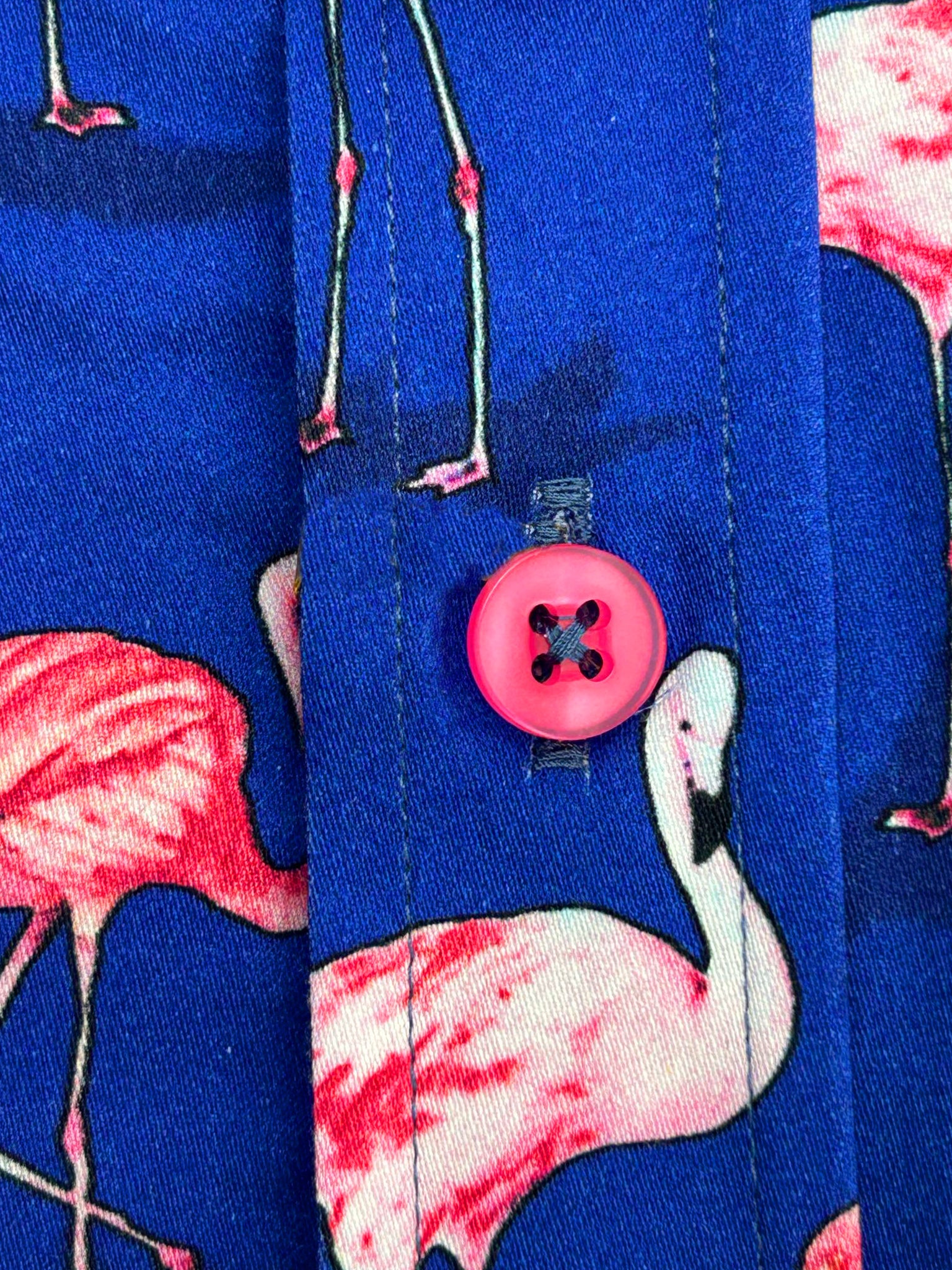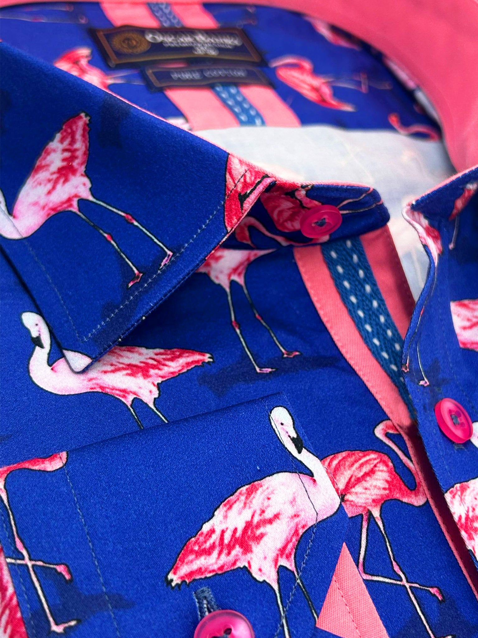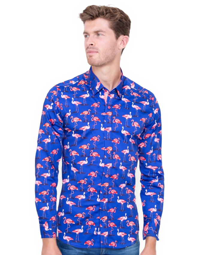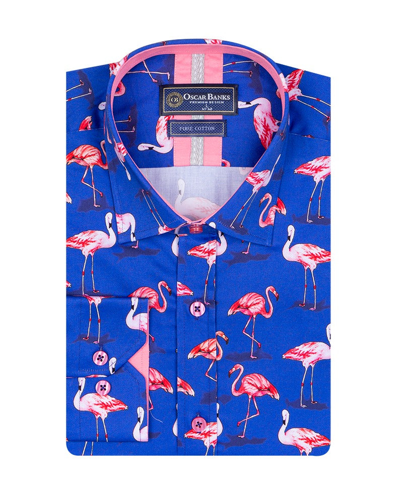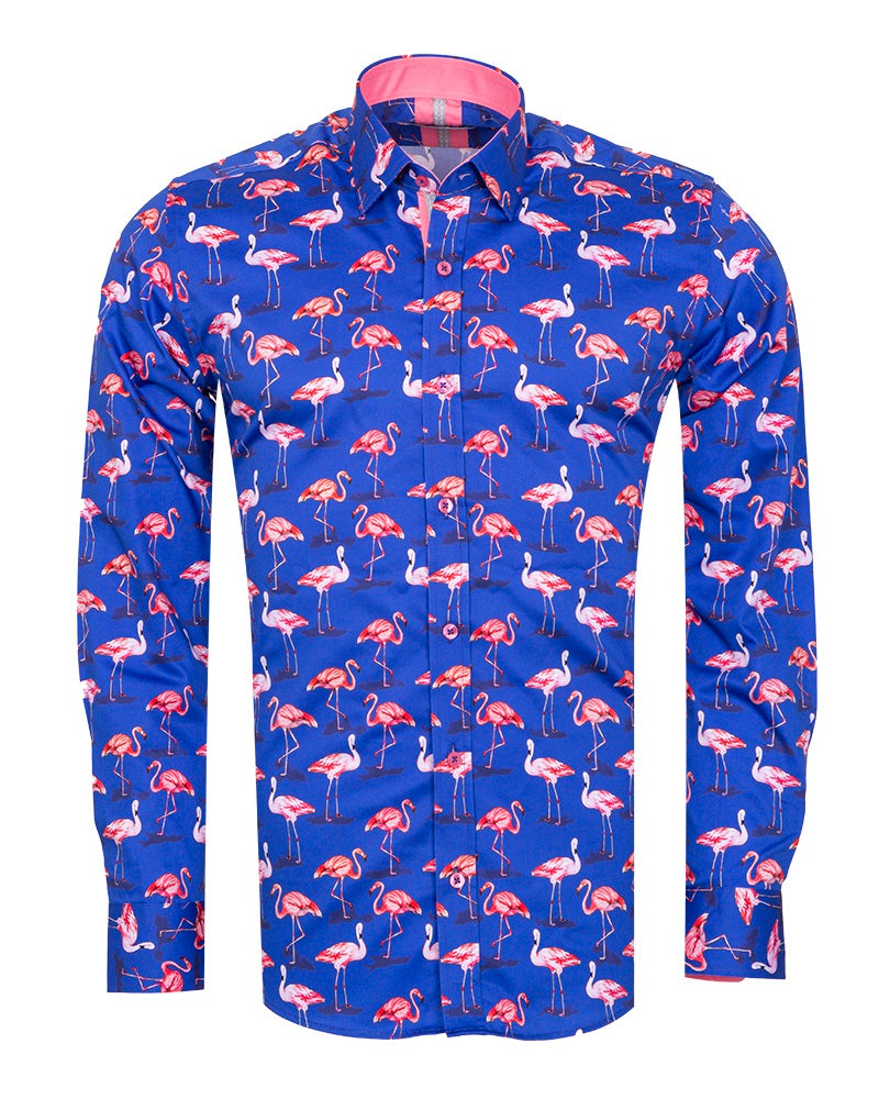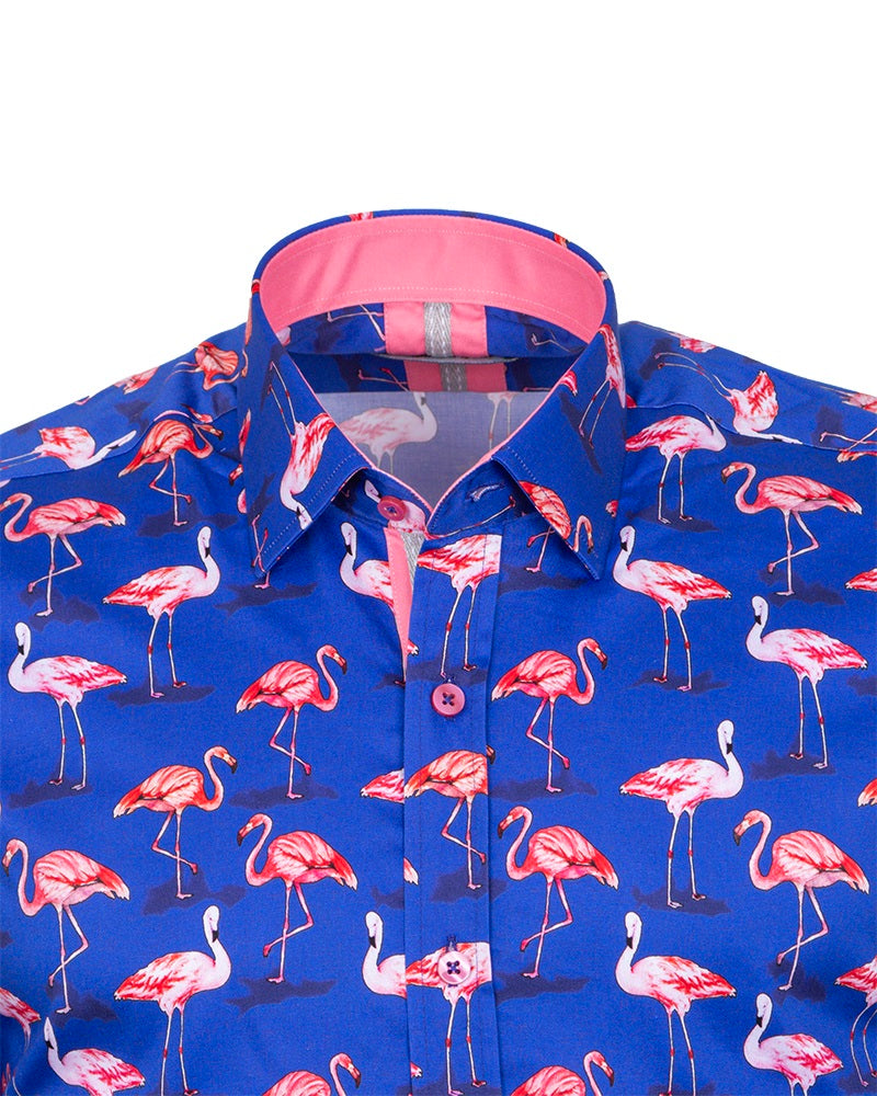 What sets this shirt apart is its unique flamingo print, perfect for making a bold fashion statement. The contrasting collar and cuff add a touch of sophistication, while the included matching handkerchief elevates your ensemble.