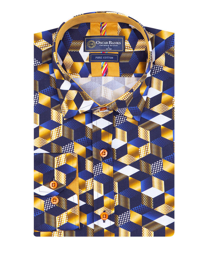 Introducing the Dark Blue Geo Print Shirt with Matching Handkerchief, a stylish addition to any man's wardrobe. This shirt features a unique geo print design that adds a modern touch to classic elegance.