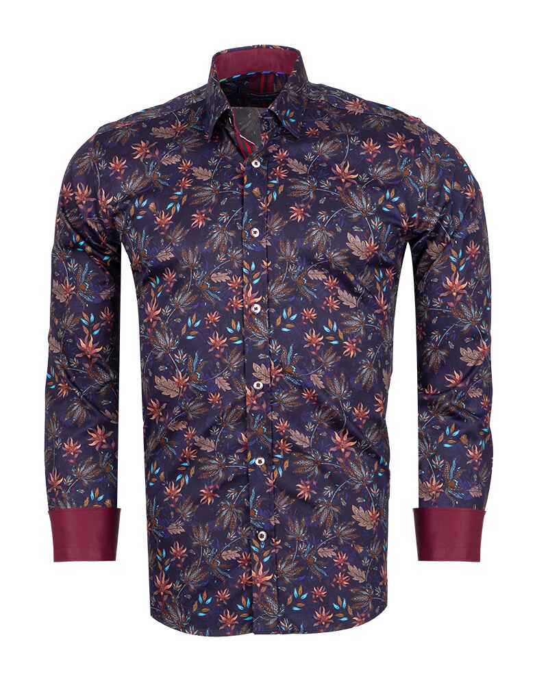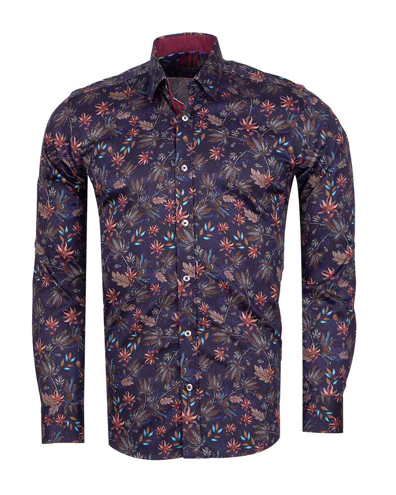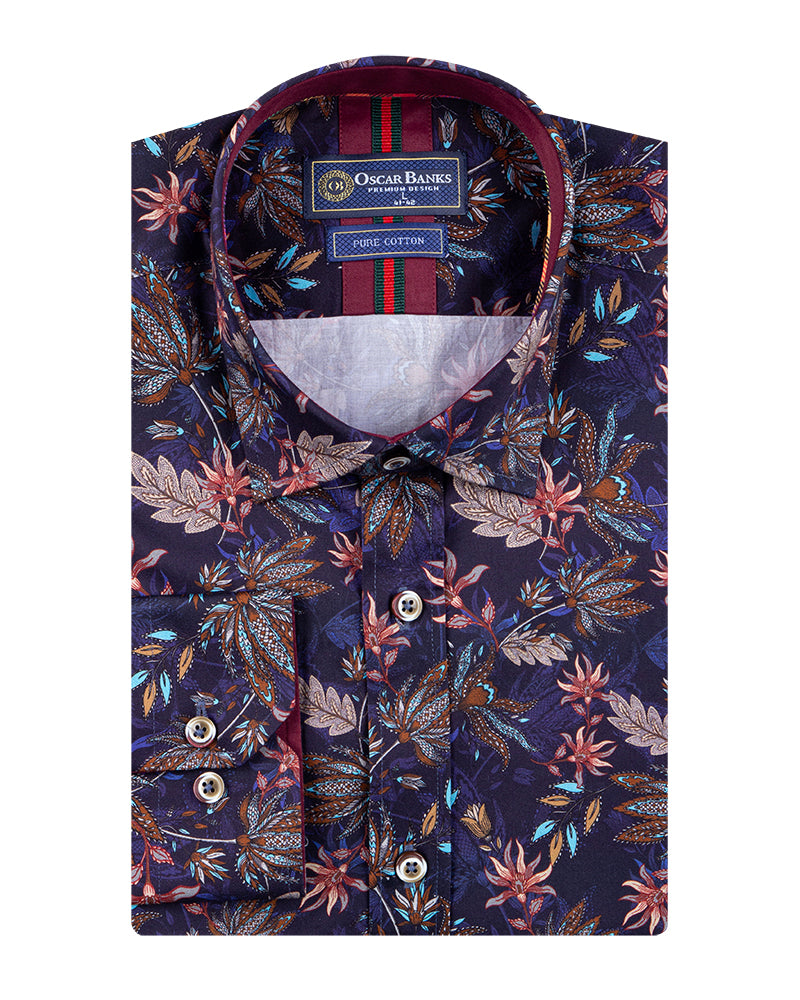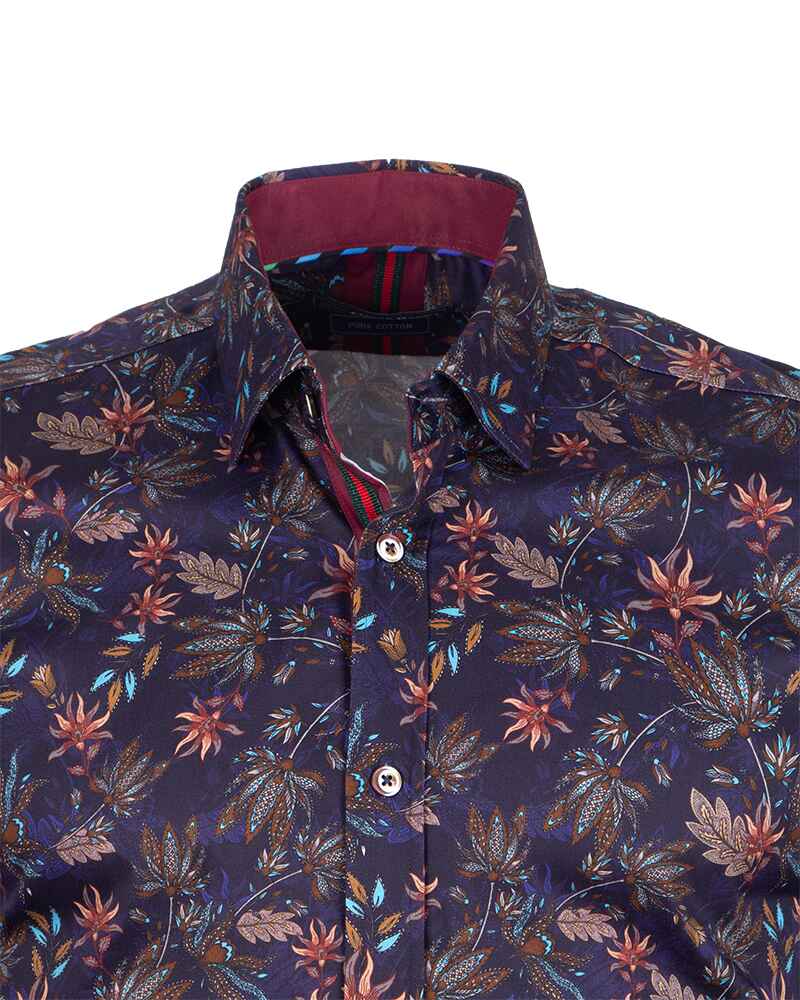 Dark Blue Leaf Print Men's Shirt with Matching Handkerchief