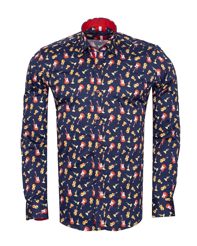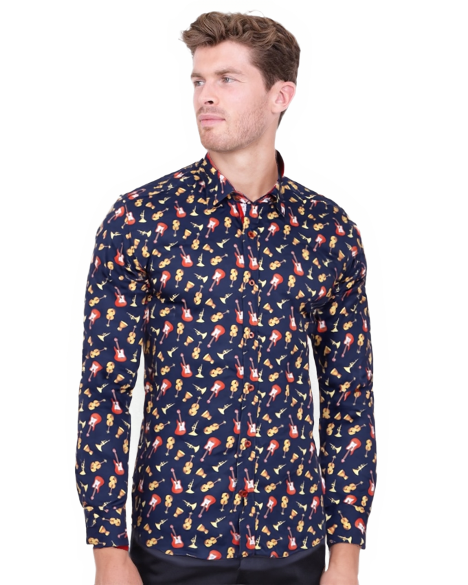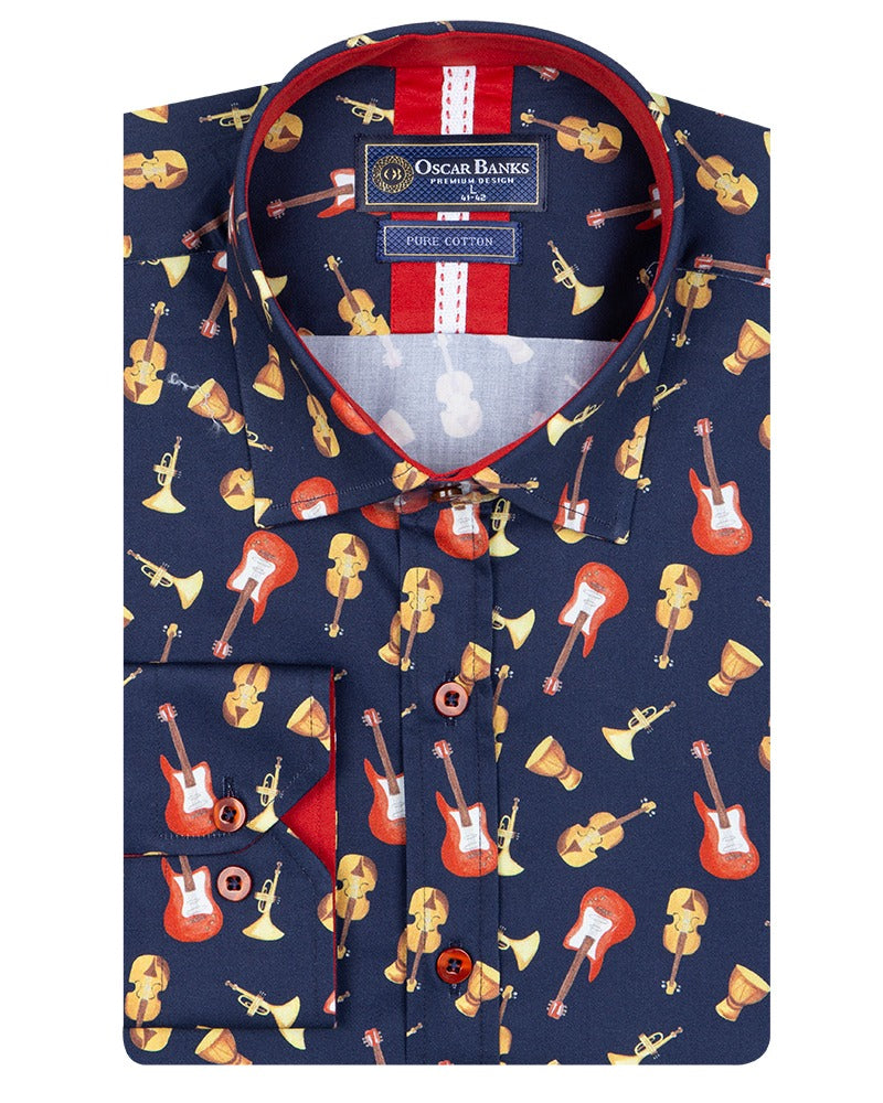 Dark Blue Orchestra Instrument Print Shirt with Matching Handkerchief