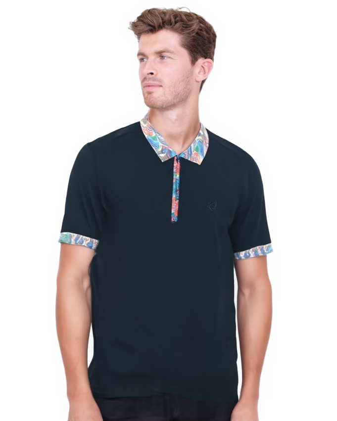 Introducing the Dark Blue Polo T-Shirt With Paisley Collar, a stylish addition to your wardrobe. This polo features a unique paisley design on the collar, adding a touch of sophistication to a classic piece.