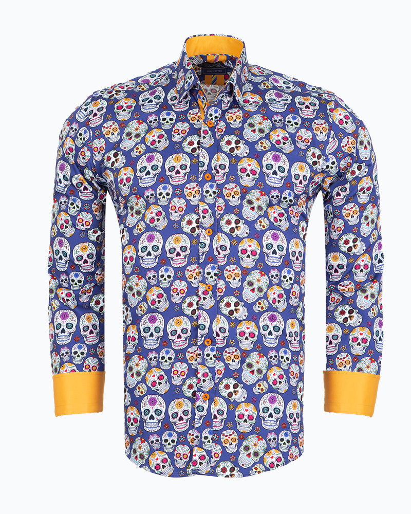 Introducing the Dark Blue Day of the Dead Skull Print Shirt with Matching Handkerchief, a unique addition to your wardrobe. Crafted from 100% satin cotton, this shirt offers both comfort and style.