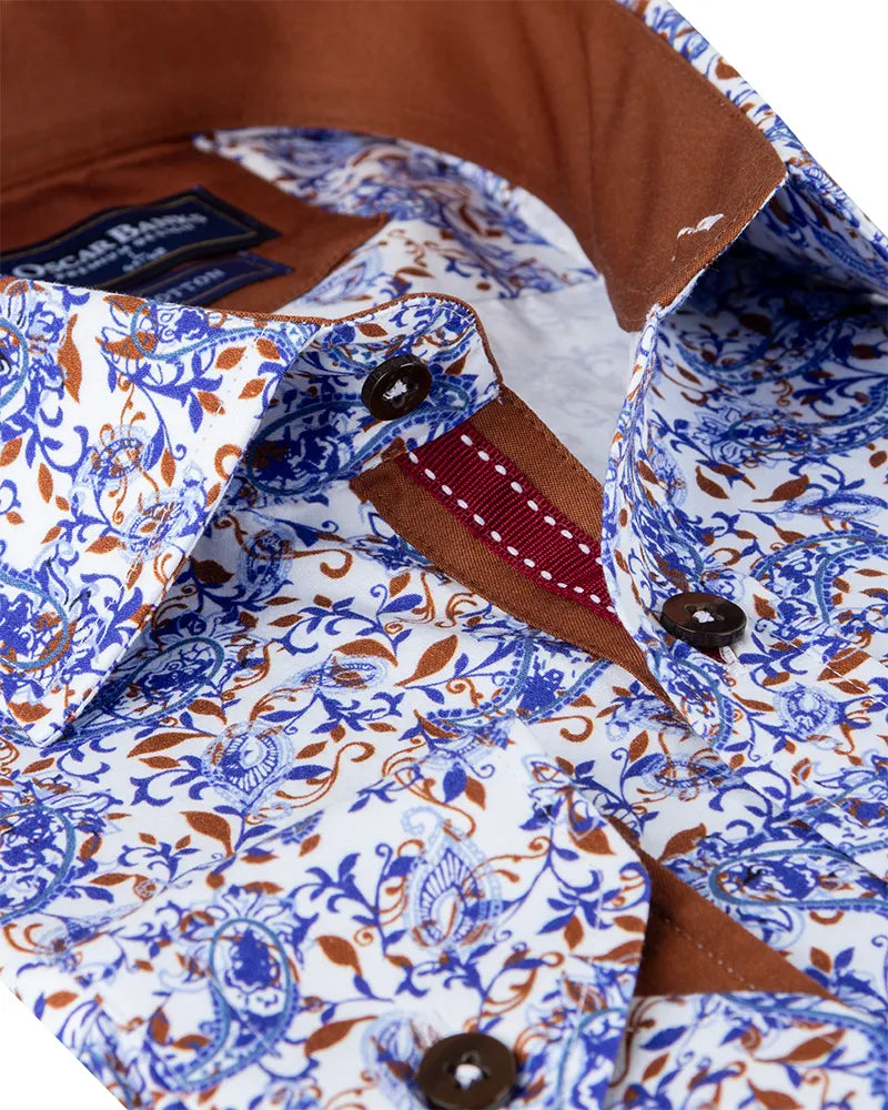 The striking paisley print is complemented by a contrasting collar and cuff, making it a standout piece for any occasion. The inclusion of a matching handkerchief adds an extra touch of sophistication, allowing you to elevate your style effortlessly.