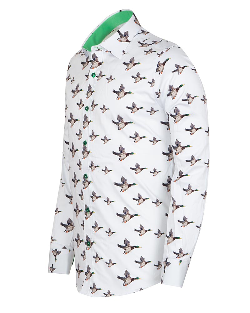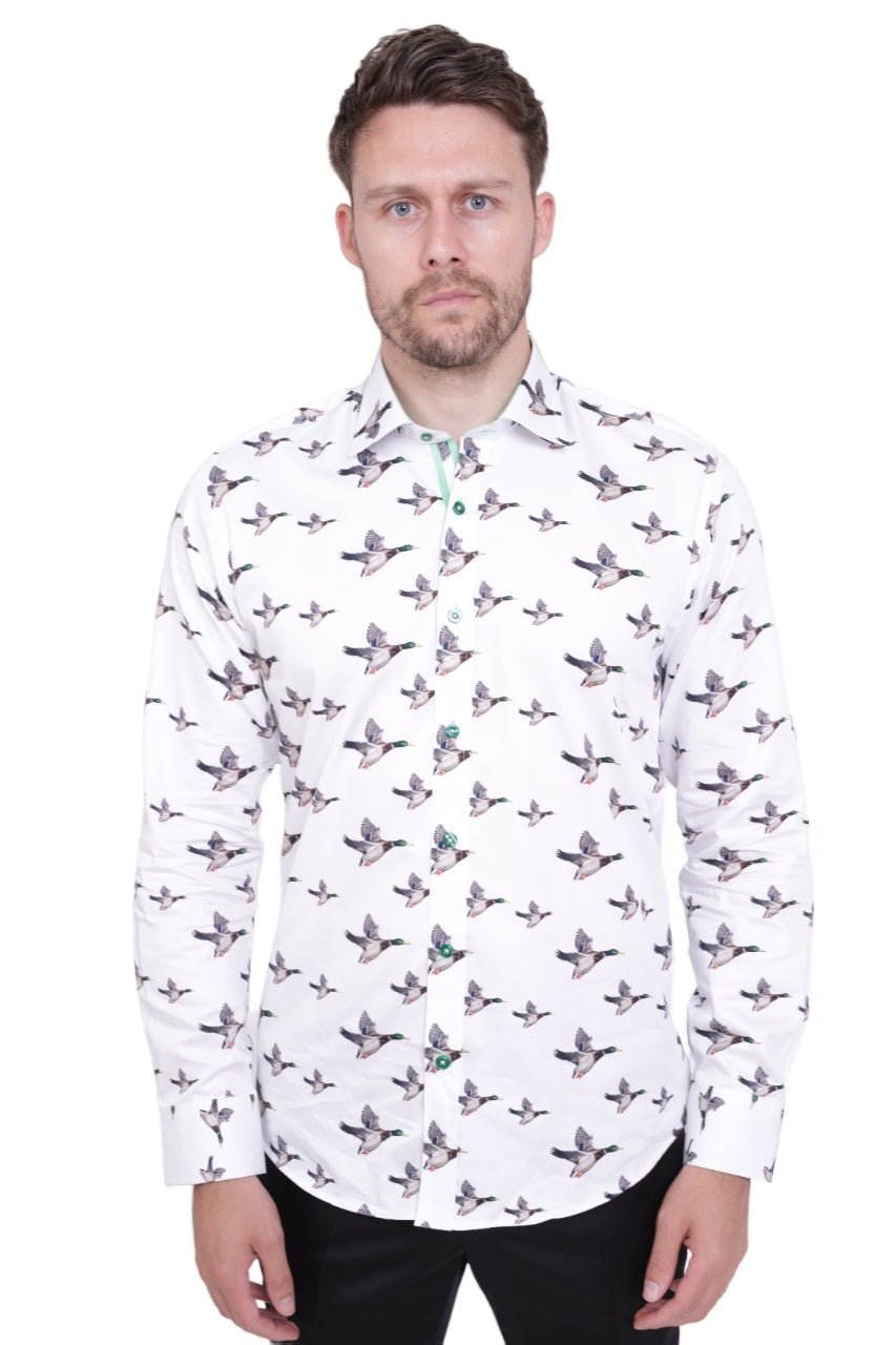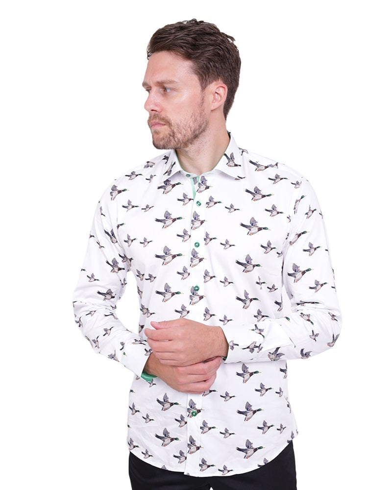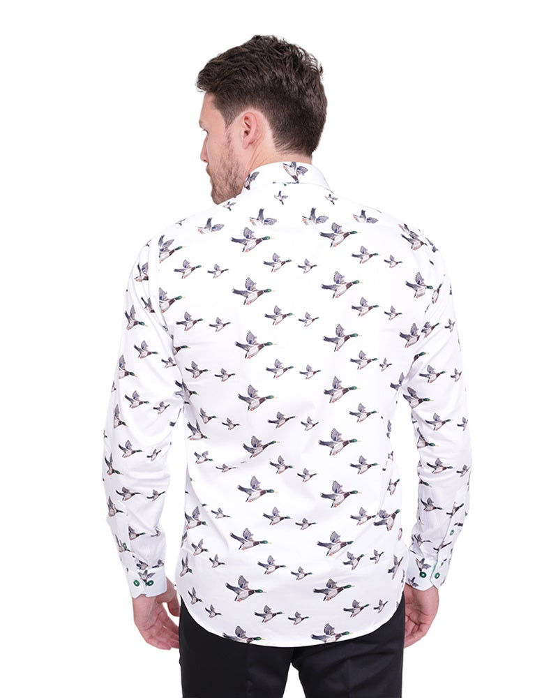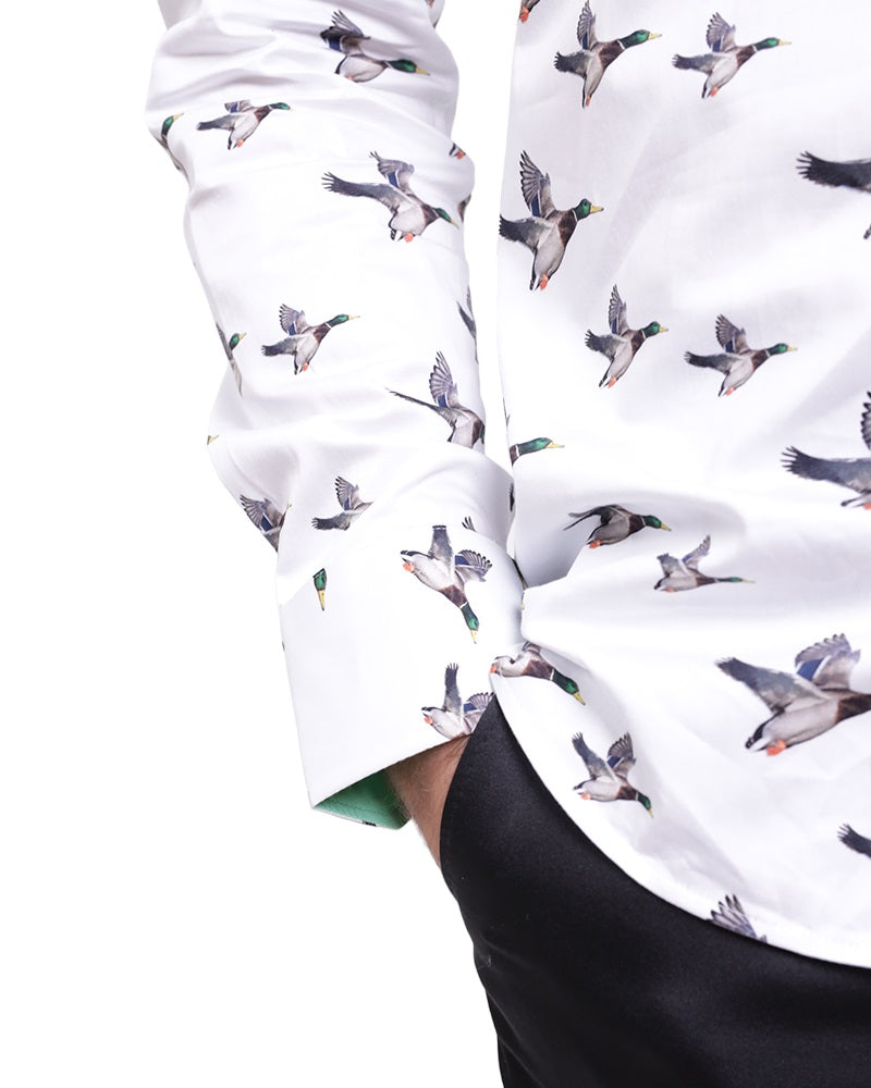Discover the elegance of the Flying Mallard Print Shirt with Matching Handkerchief, a perfect blend of style and sophistication. Crafted from 100% satin cotton, this shirt offers a luxurious feel and exceptional comfort.
