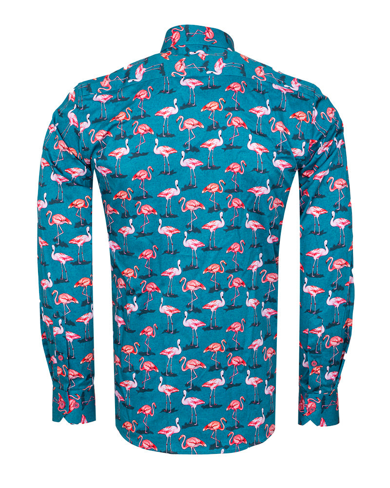 Green Flamingo Print Men's Shirt with Matching Handkerchief