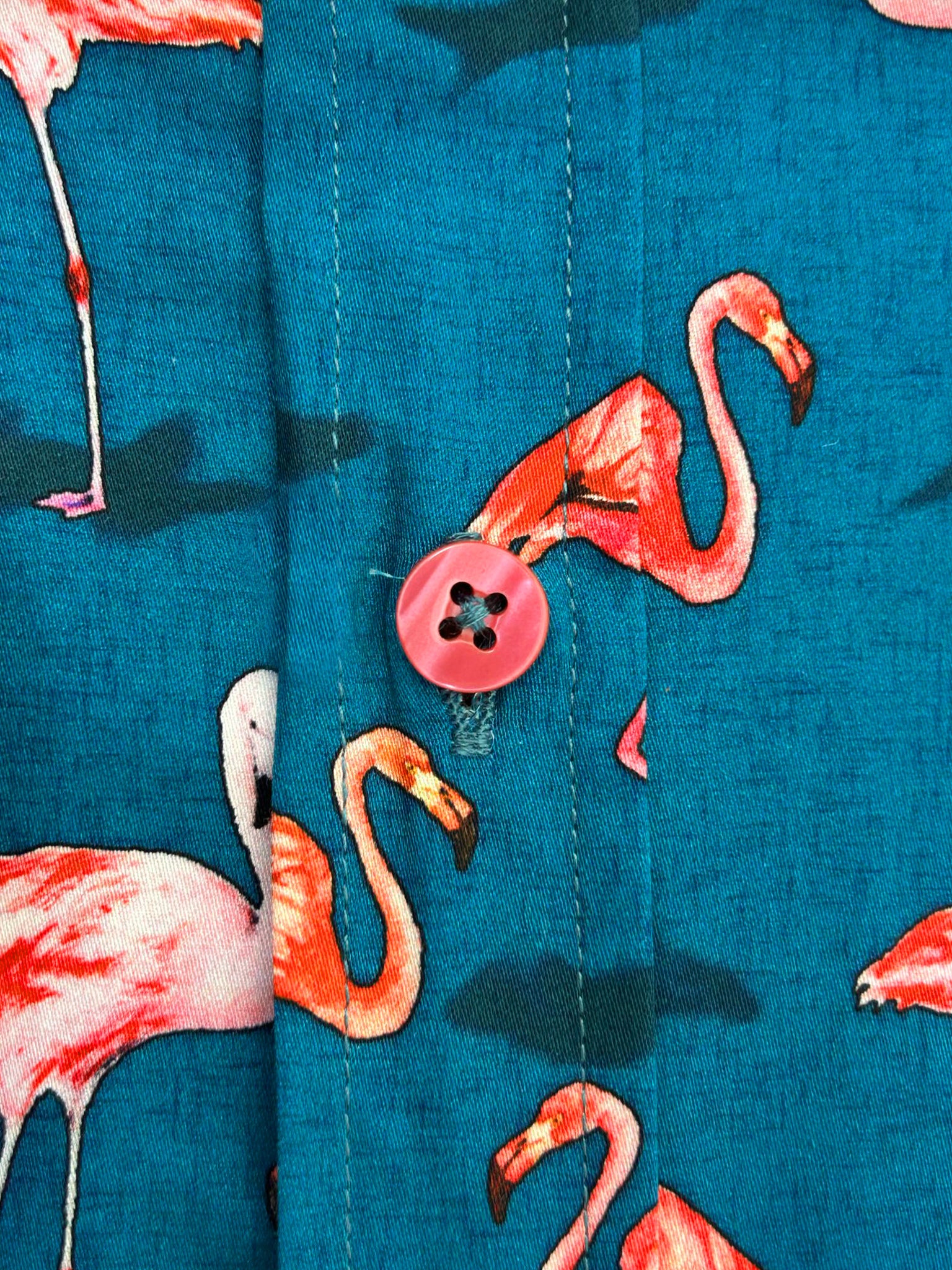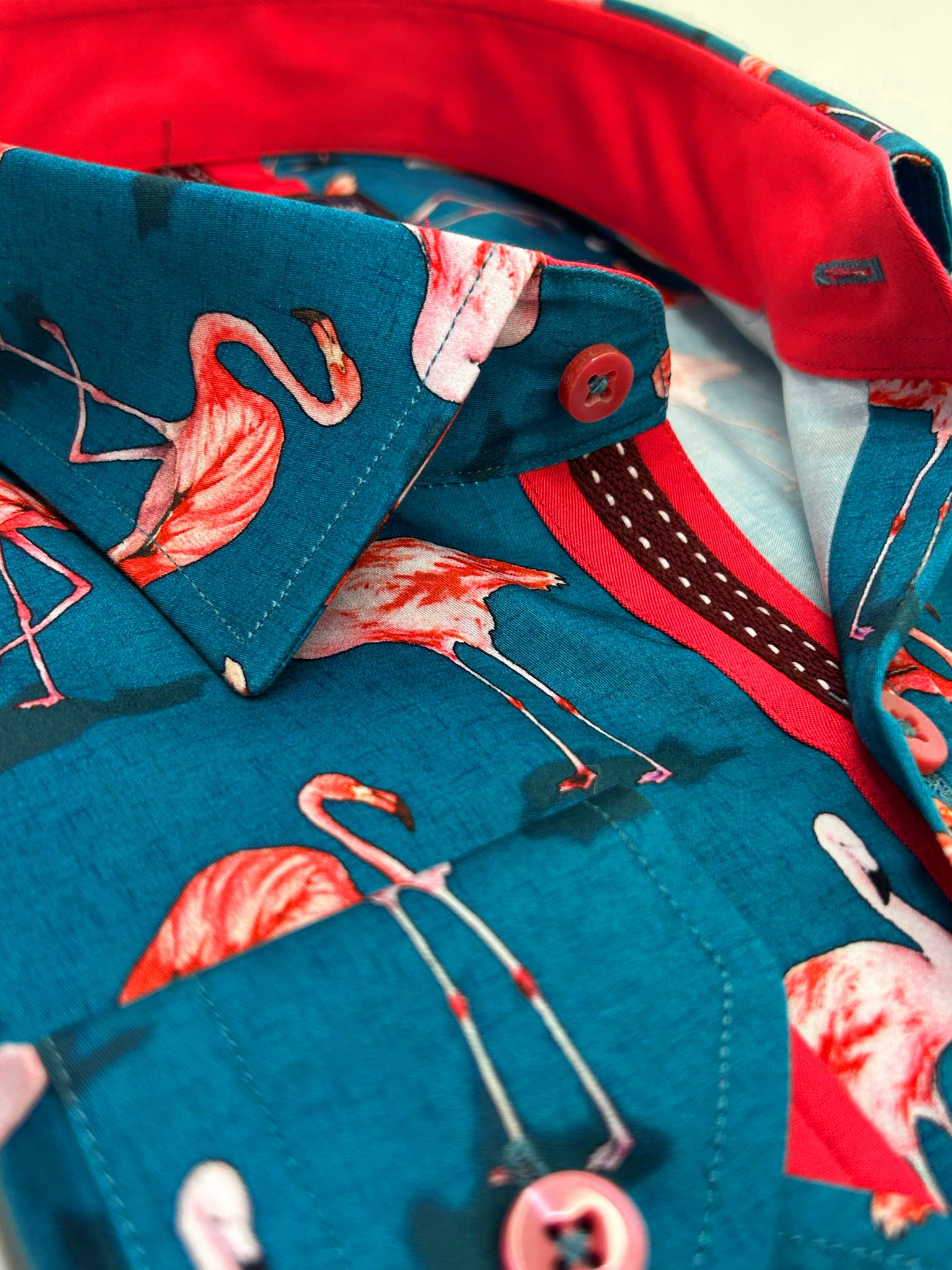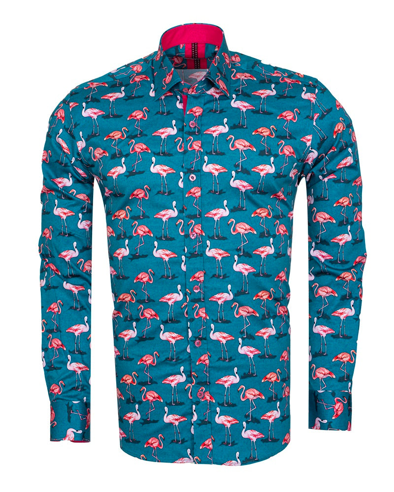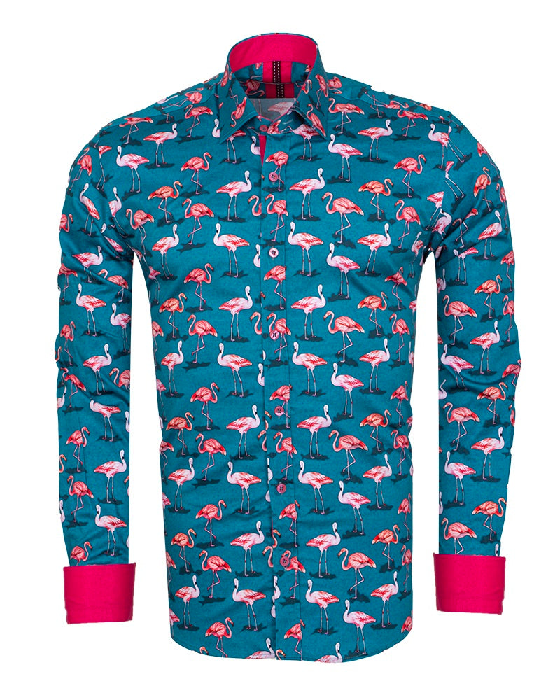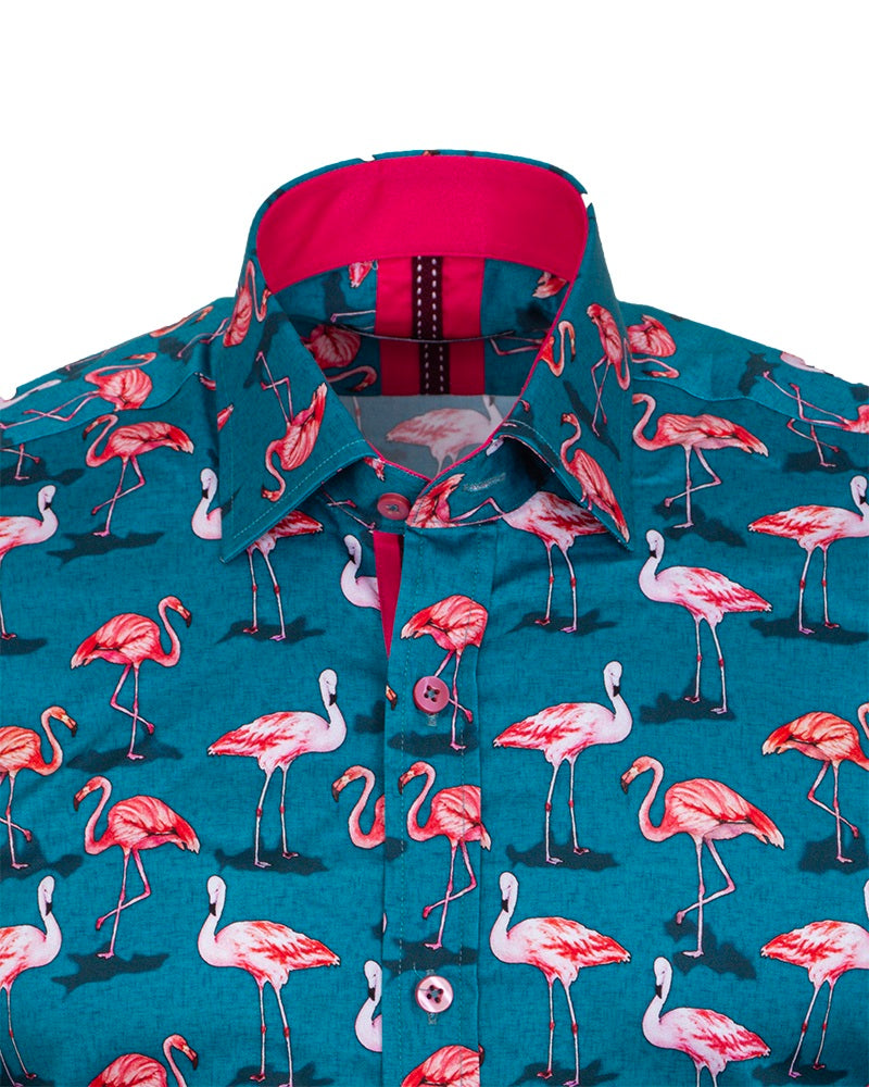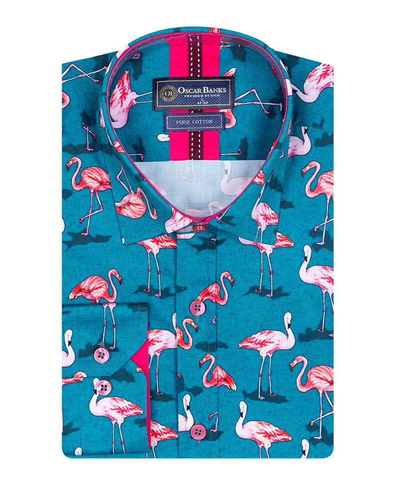 What sets this shirt apart is its vibrant flamingo print, complemented by a contrasting collar and cuffs that add a touch of sophistication. The included matching handkerchief enhances its uniqueness, making it perfect for both casual outings and special occasions.
