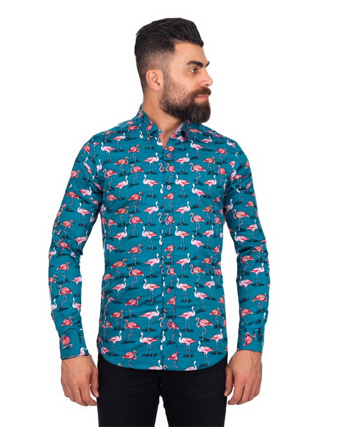 Introducing the Green Flamingo Print Men's Shirt with Matching Handkerchief, a standout piece that redefines casual elegance. Crafted from 100% satin cotton, this shirt offers a luxurious feel while ensuring comfort throughout the day.