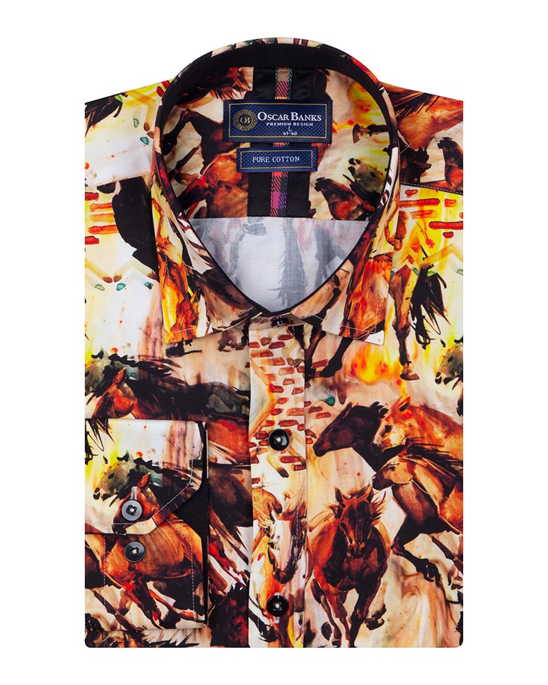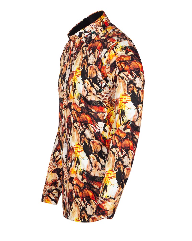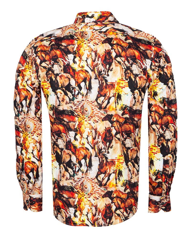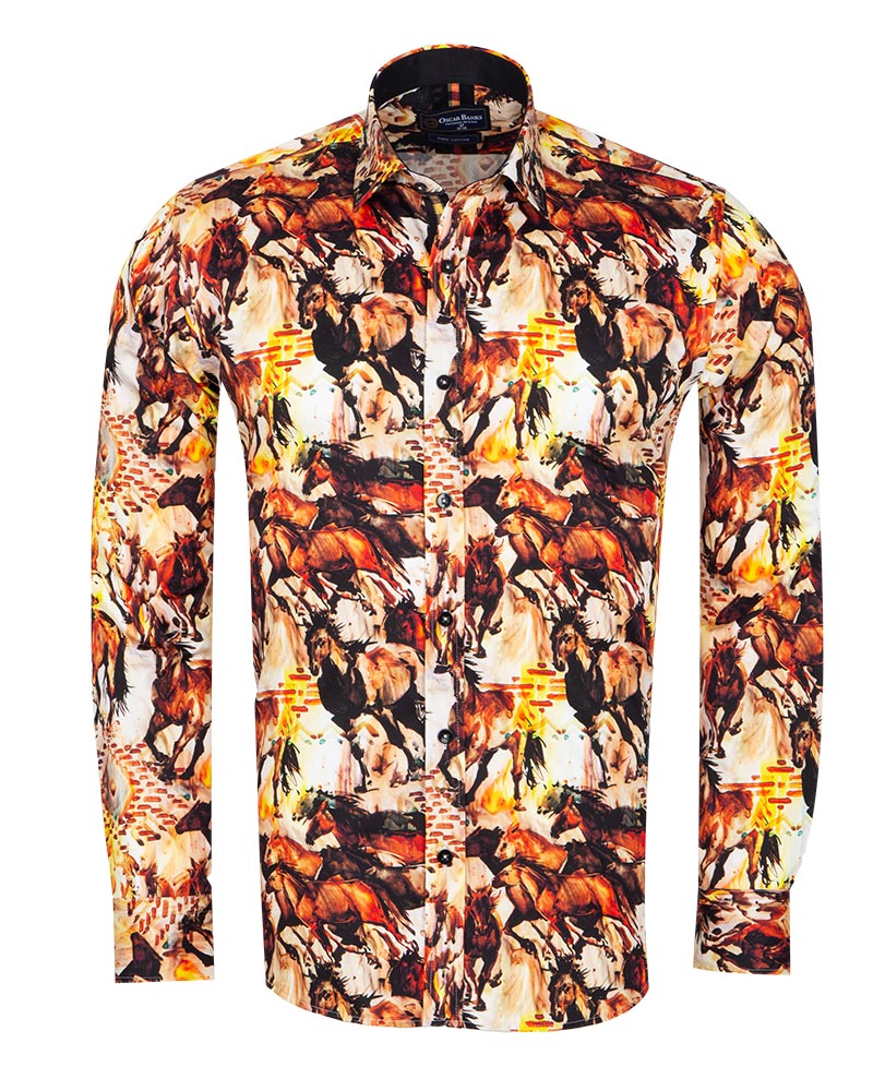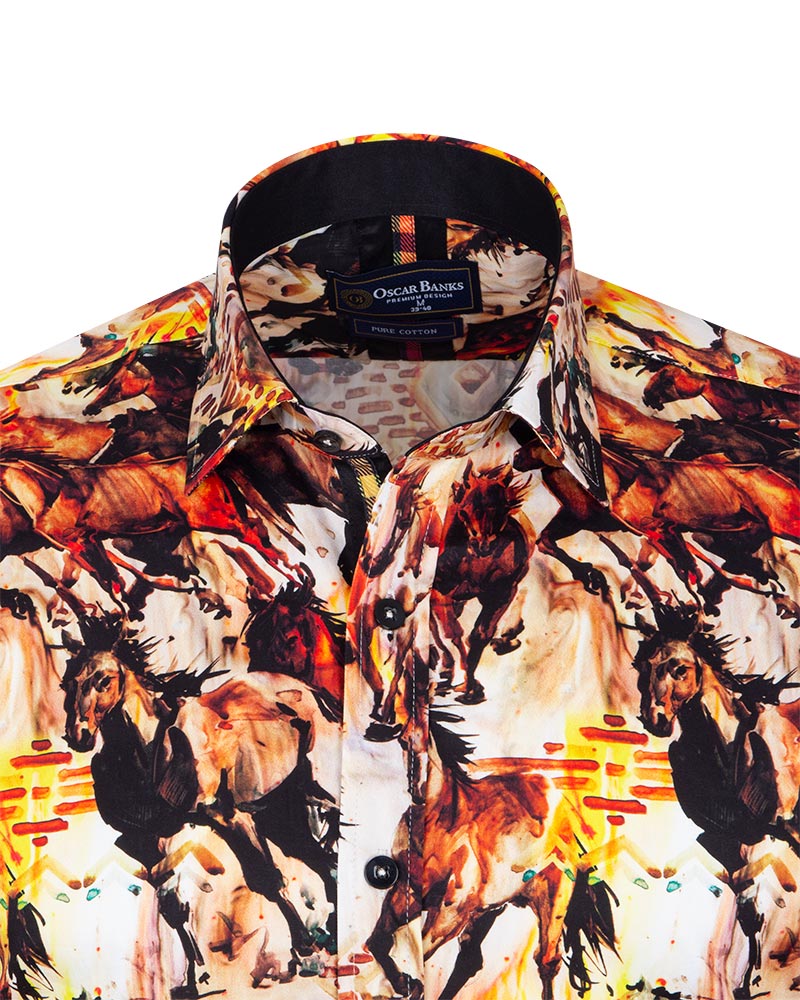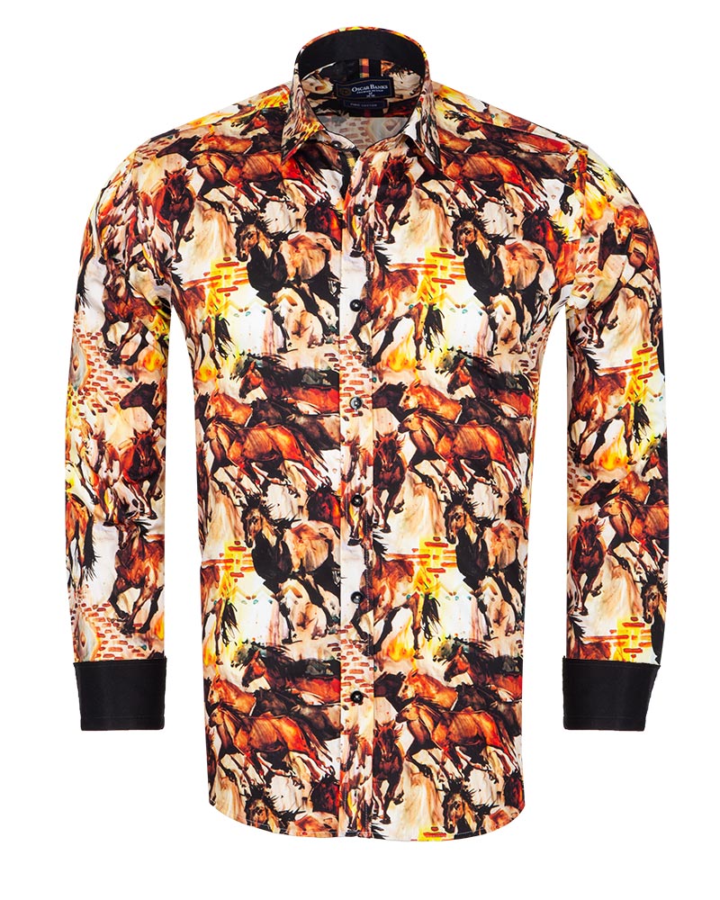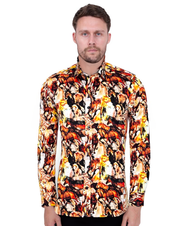 Introducing the Horse Print Men's Shirt with Matching Handkerchief, a stylish addition to any wardrobe. Crafted from 100% satin cotton, this shirt offers both comfort and elegance.