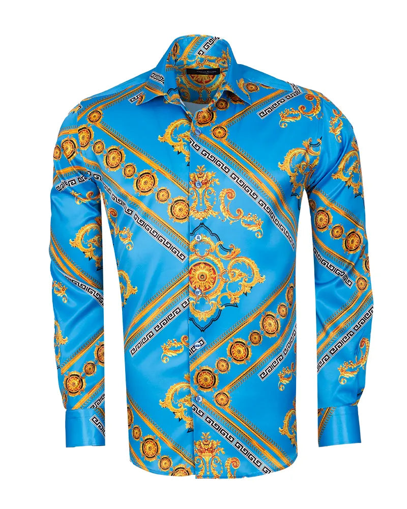 Introducing the Light Blue Baroque Chain & Paisley Print Men`s Shirt, a perfect blend of elegance and comfort. This shirt features a stunning Roman ornament print that adds a touch of sophistication to any outfit.