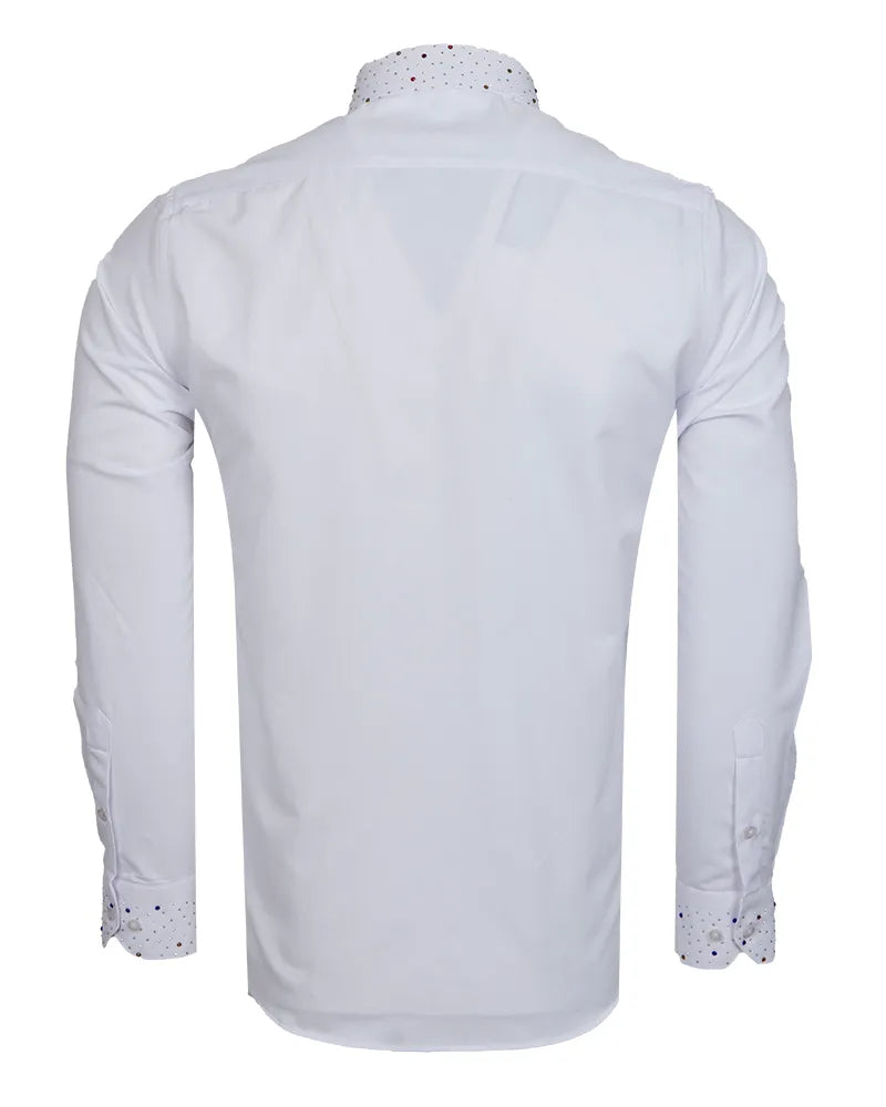 Introducing the Men’s White Dress Shirt with Crystal-Studded Collar and Cuffs, a stylish addition to your wardrobe. This shirt features a unique maze print that adds a touch of sophistication to any outfit.