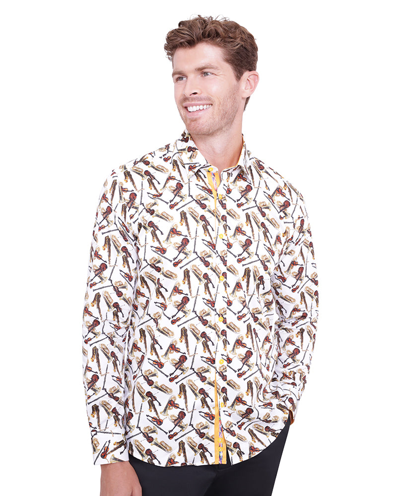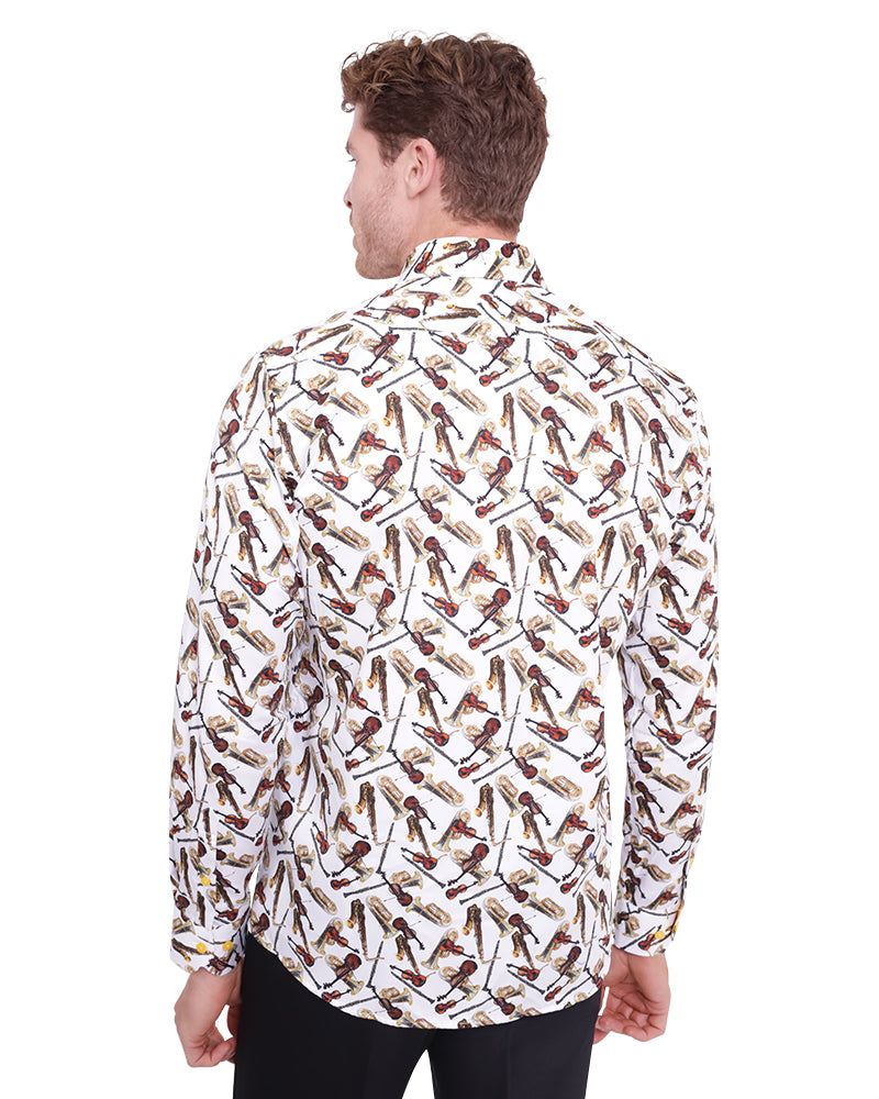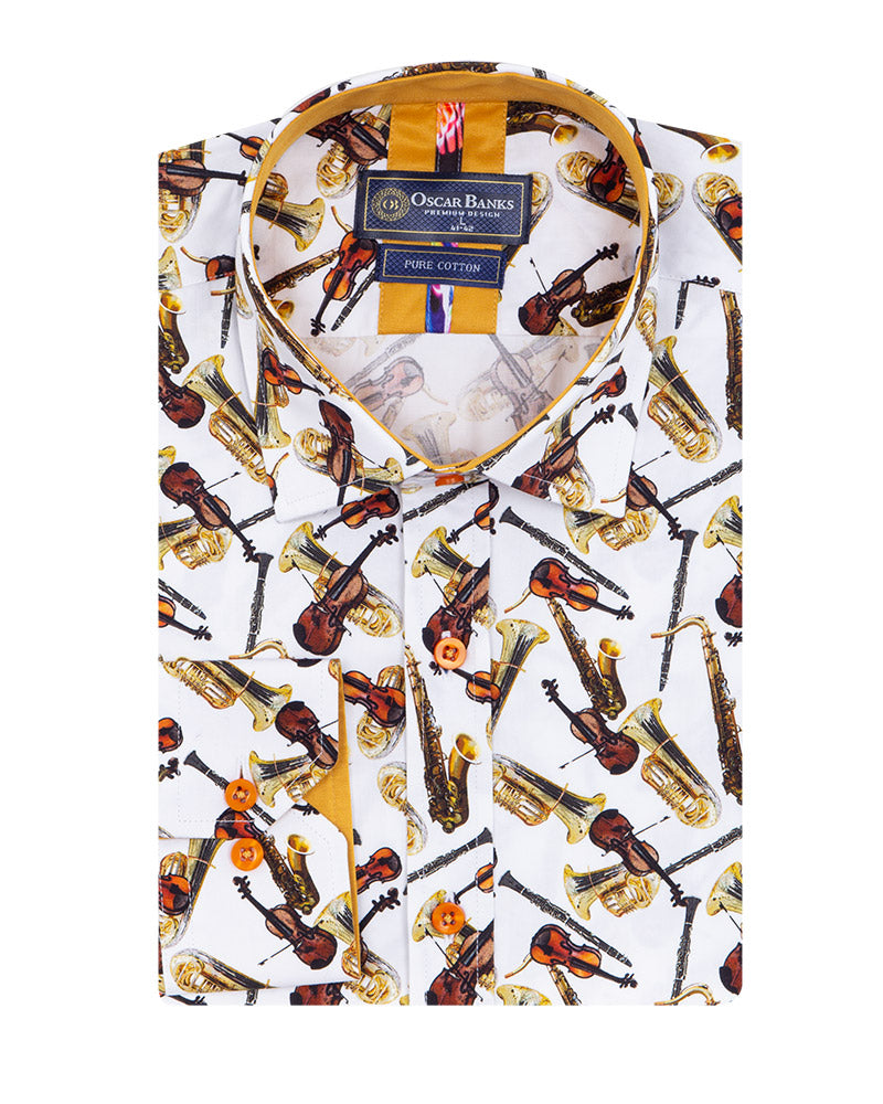 Elevate your style with the Musical Instrument Print Shirt featuring a charming Violin and Saxophone design. Crafted from 100% satin cotton, this shirt offers both comfort and sophistication.