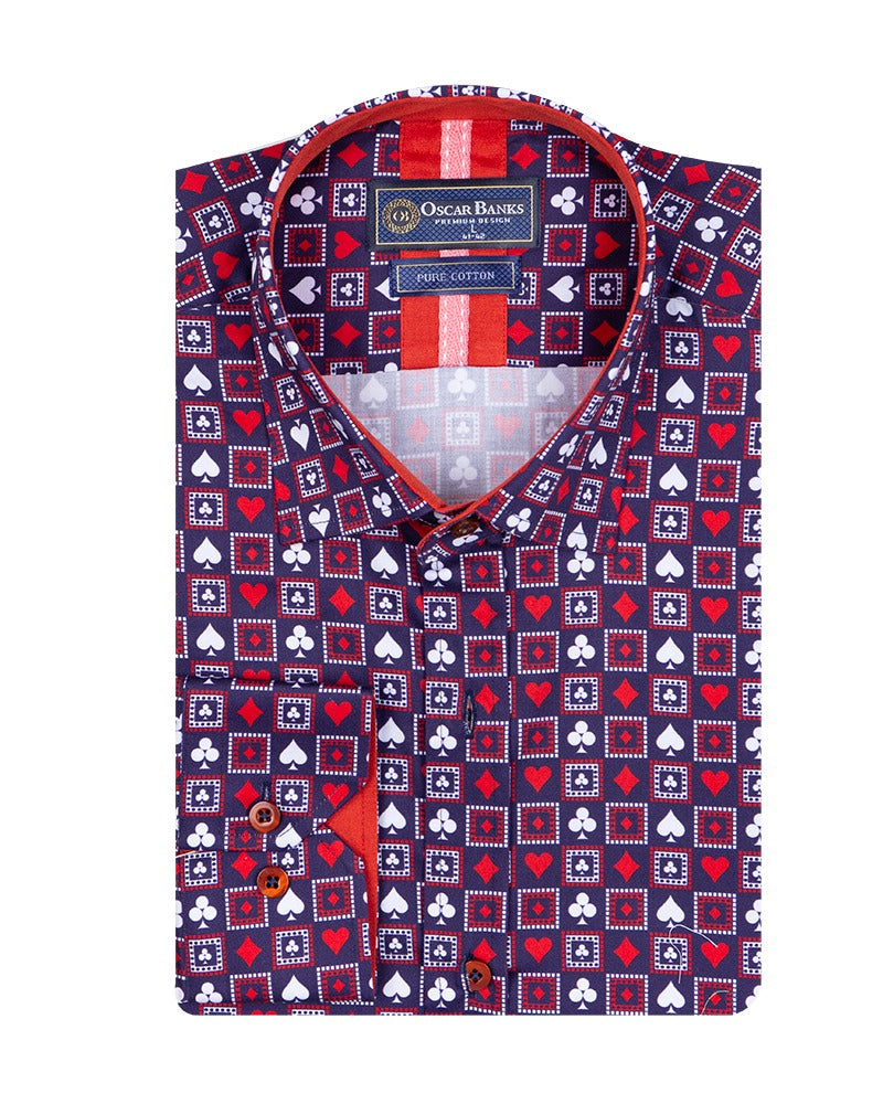 Introducing the Navy Playing Card Symbols Print with Matching Handkerchief, a truly unique addition to your wardrobe. Crafted from 100% satin cotton, this shirt offers both comfort and style, making it perfect for any occasion.