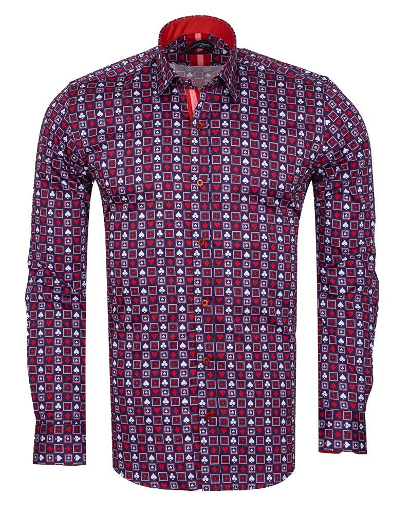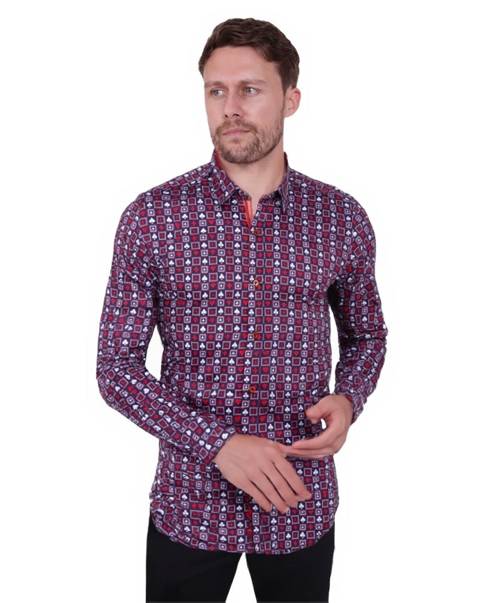 The eye-catching playing card symbols print sets this piece apart, while the contrasting collar and cuff add a touch of sophistication. Complete with a matching handkerchief, this ensemble ensures you stand out effortlessly.