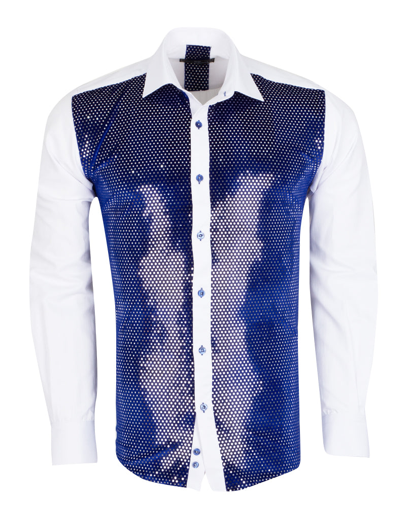 Introducing the Navy Sequin Fashion Shirt with Plain Collar Tip Design, a perfect blend of style and sophistication. This shirt features a unique plain collar tip design that adds a touch of elegance to your wardrobe.