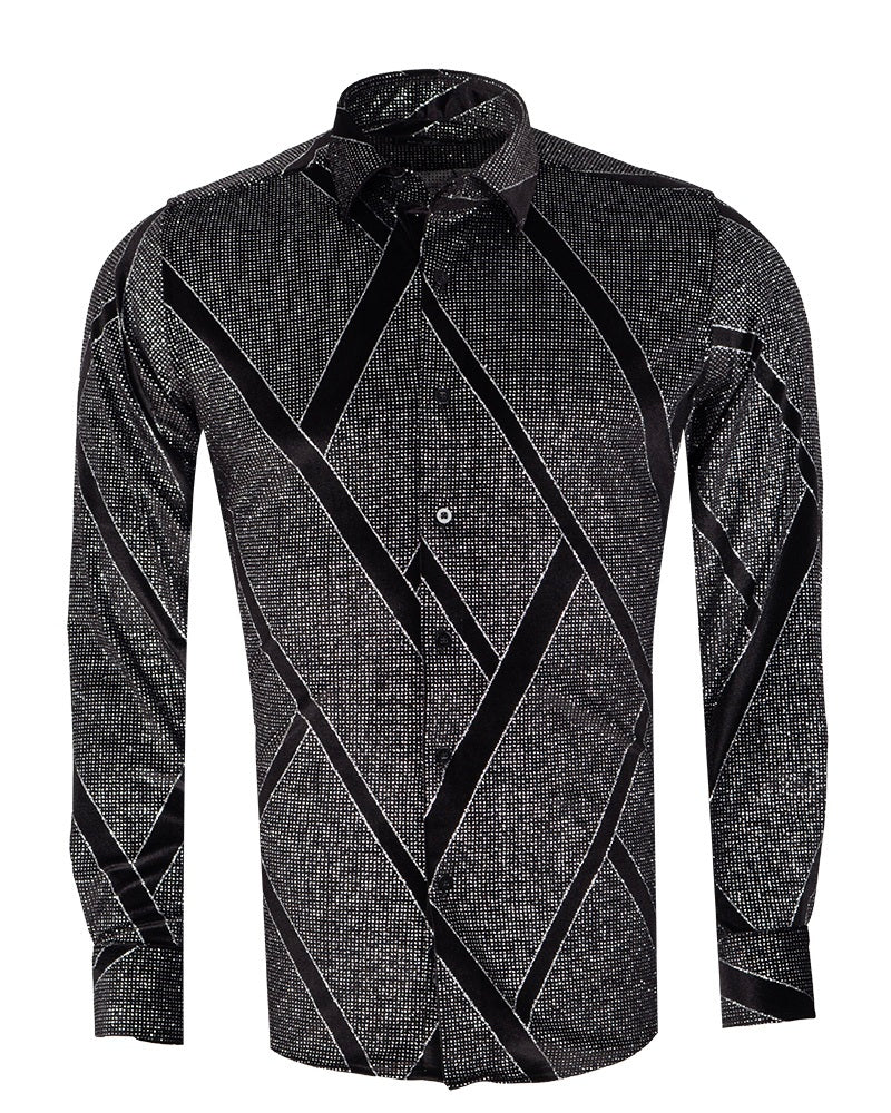 Oscar Banks Premium Shiny Black and Grey Geometric Pattern Shirt