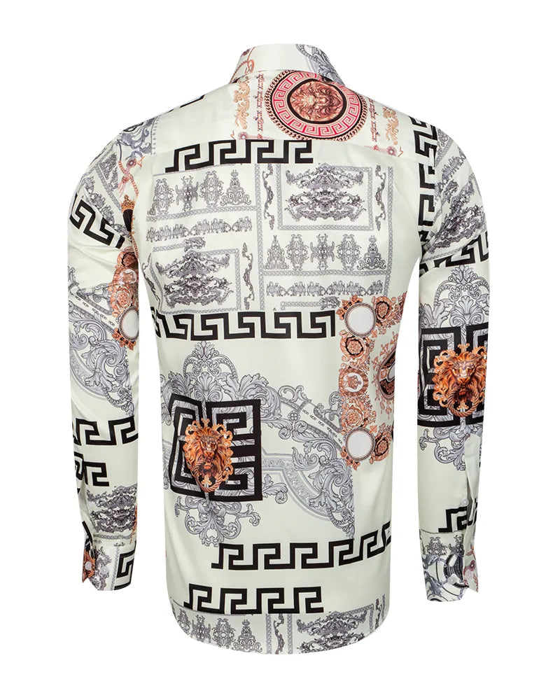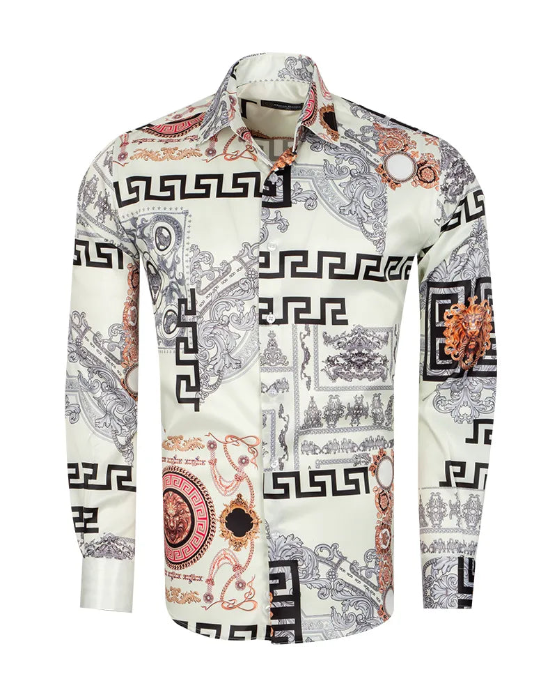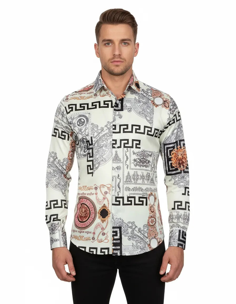 Introducing the Oscar Banks Premium Cream Satin Baroque Print Dress Shirt, a stylish addition to your wardrobe. This shirt features a unique maze print that adds a touch of sophistication to any outfit.