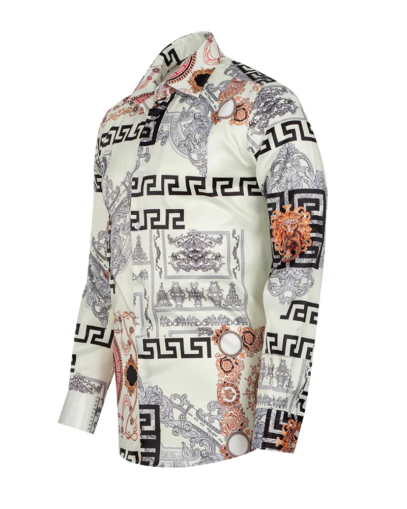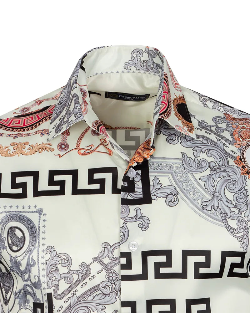Oscar Banks Premium Cream Satin Baroque Print Dress Shirt