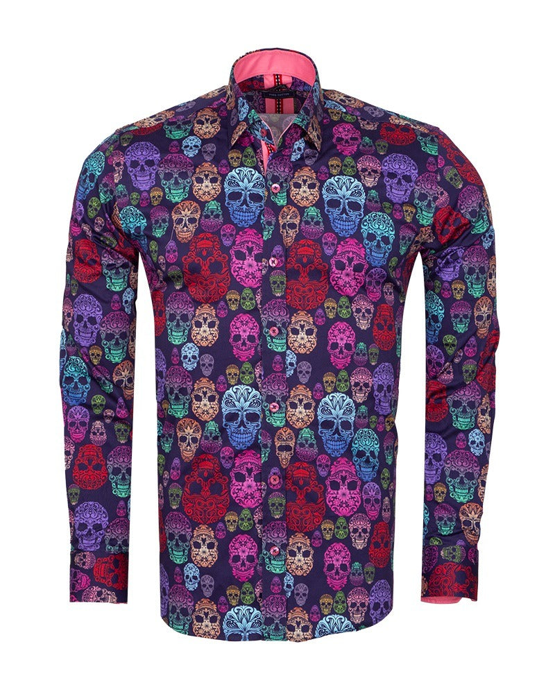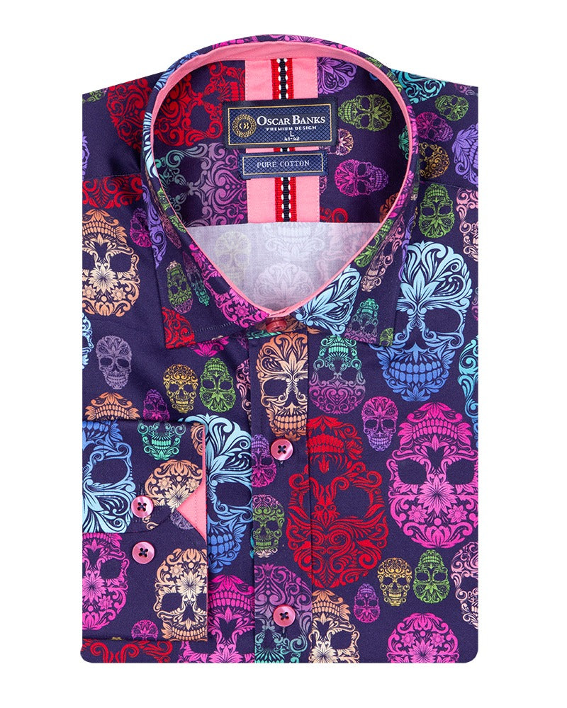 Introducing the Purple Colourful Skull Print with Matching Handkerchief, a truly unique addition to your wardrobe. Crafted from 100% satin cotton, this shirt offers both comfort and style, making it perfect for any occasion.