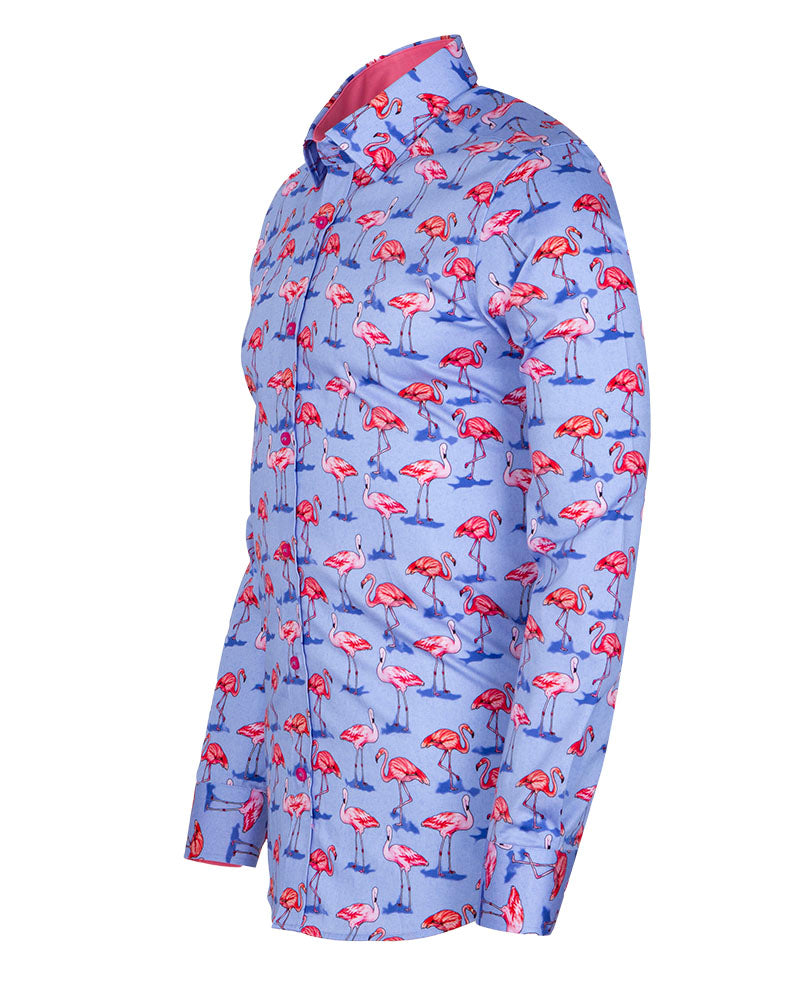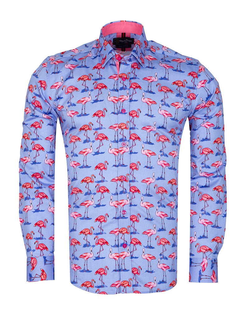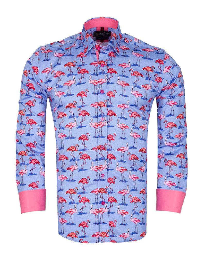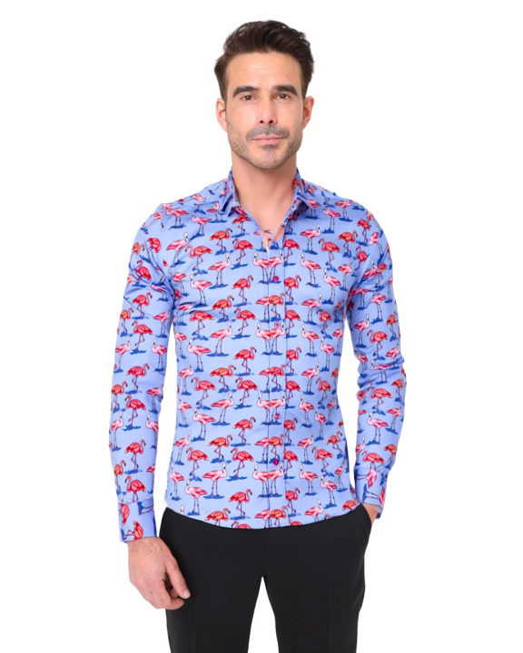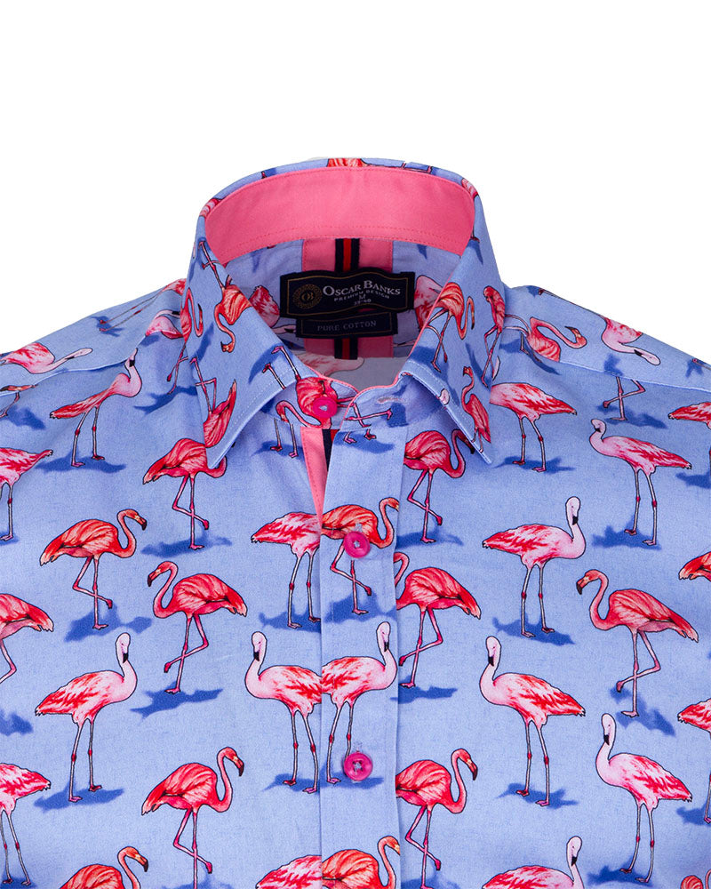What sets this shirt apart is its vibrant flamingo print, complemented by a contrasting collar and cuff that adds a touch of sophistication. The included matching handkerchief enhances its uniqueness, making it perfect for both casual outings and special occasions.
