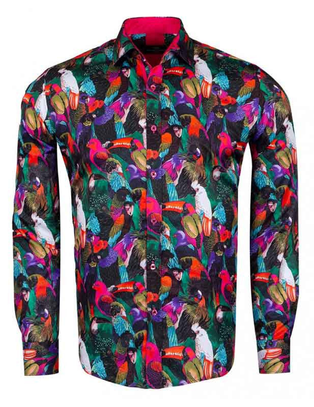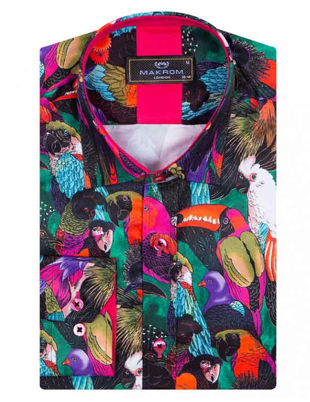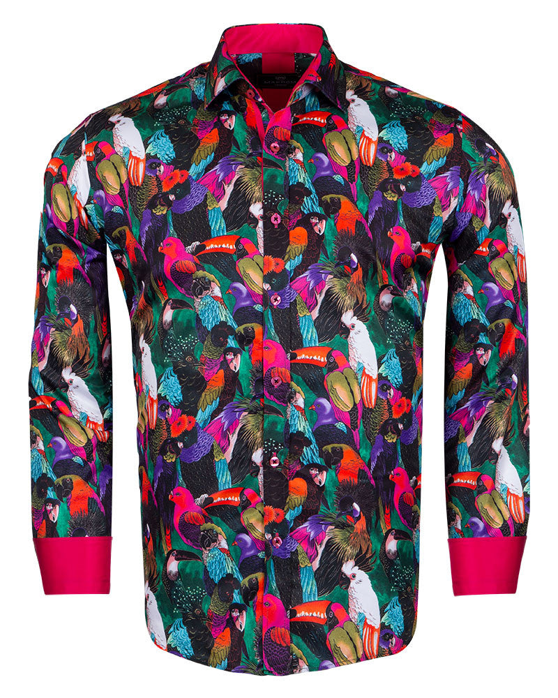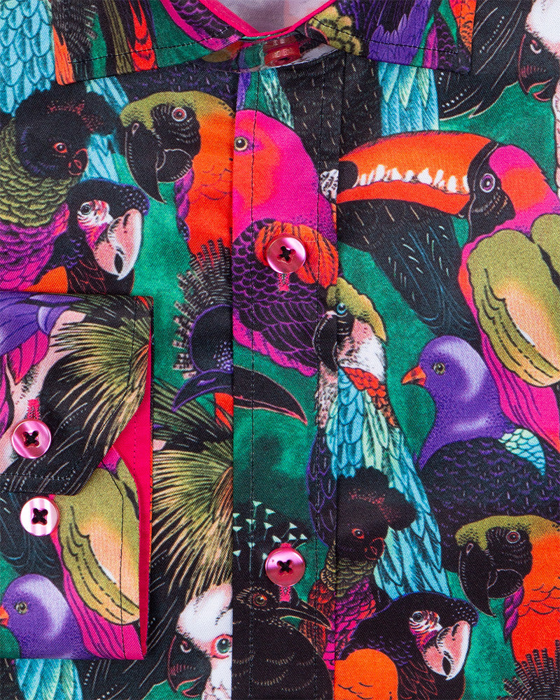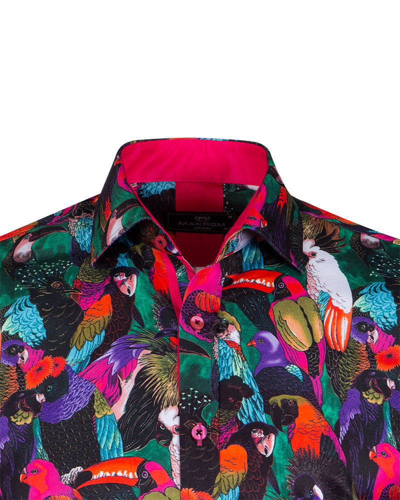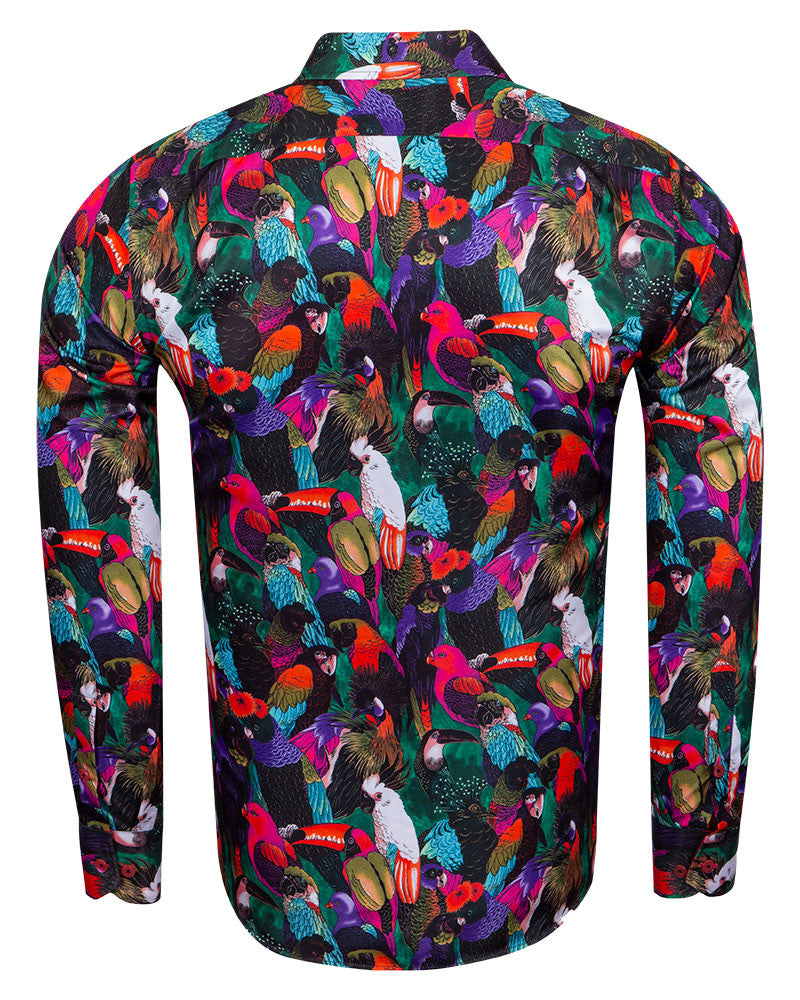 Introducing the Purple Tropical Bird Print Shirt, a vibrant addition to your wardrobe. This shirt features a stunning tropical bird print that brings a touch of the exotic to your everyday style.